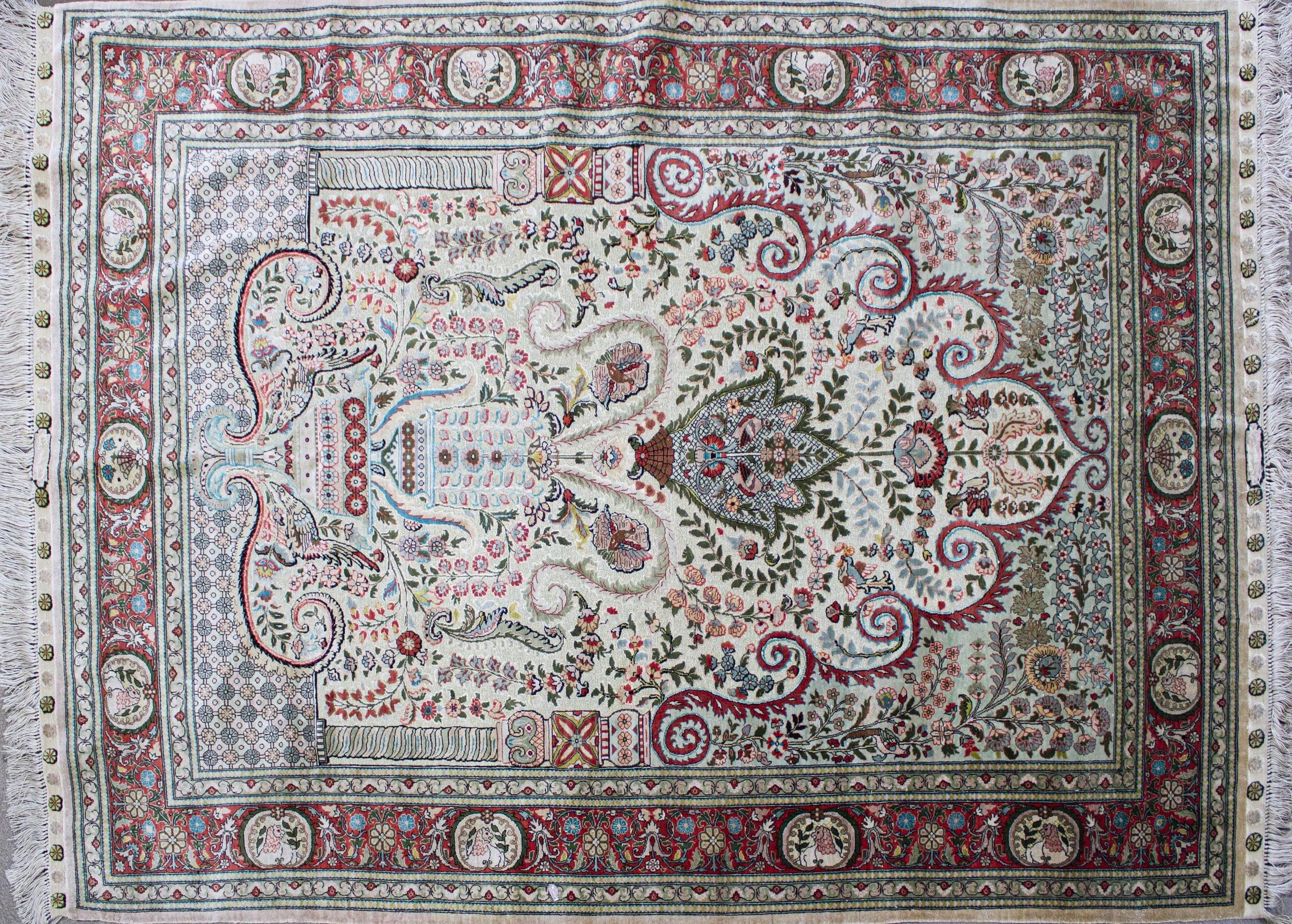 Soie à décor d'un mirhab aux vases fleuris et oiseaux branchés, tympan vert pâle amande, bordure saumon entre six galons, signé, 172x122 cm