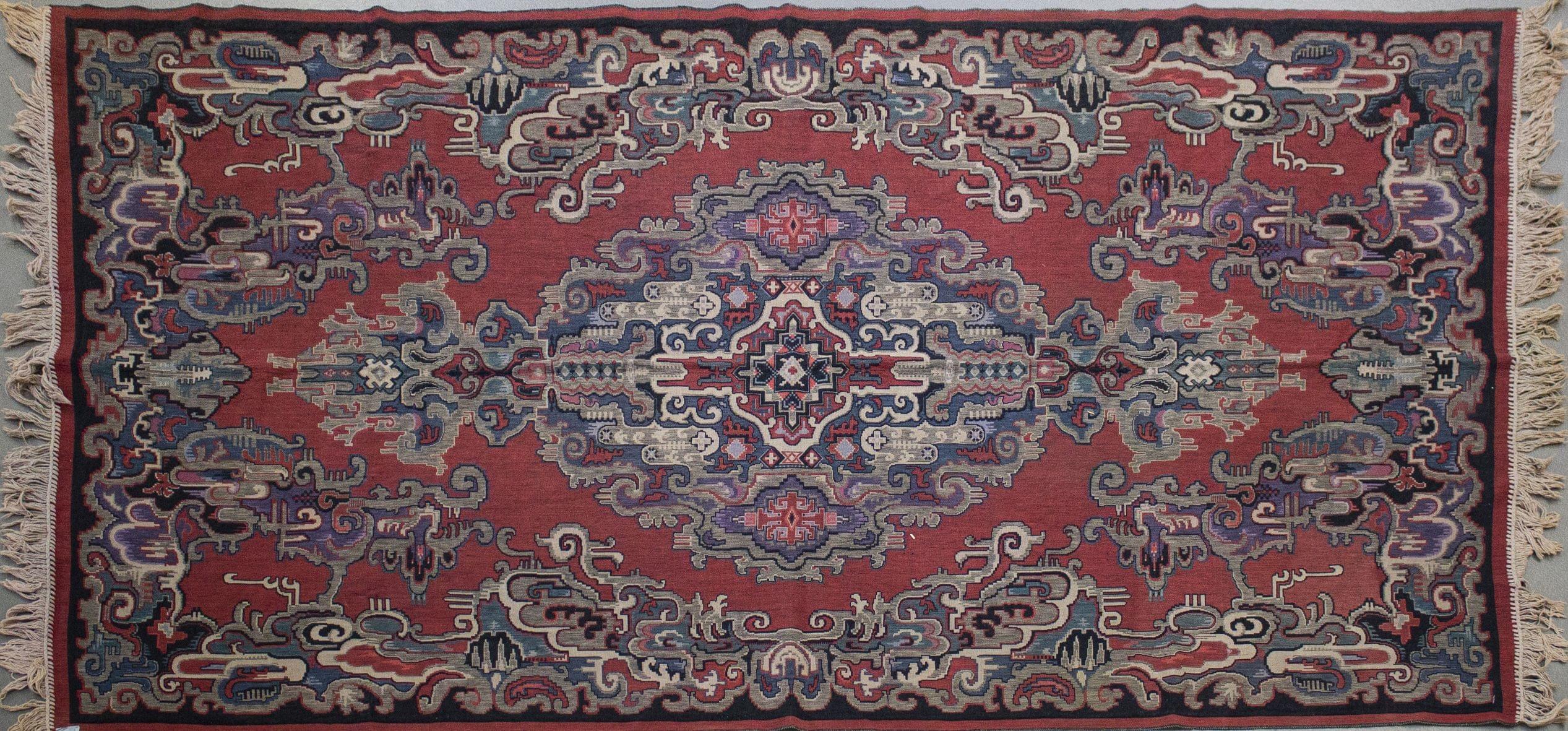 A décor de motifs stylisés sur fond rouge brique, 230x140 cm