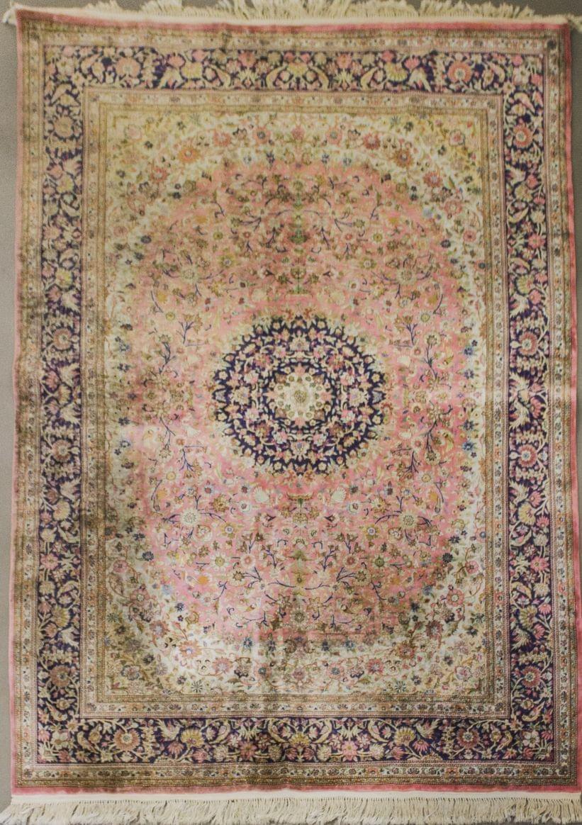 A décor d'un médaillon rond central bleu sur fond rose et beige, 167x246 cm