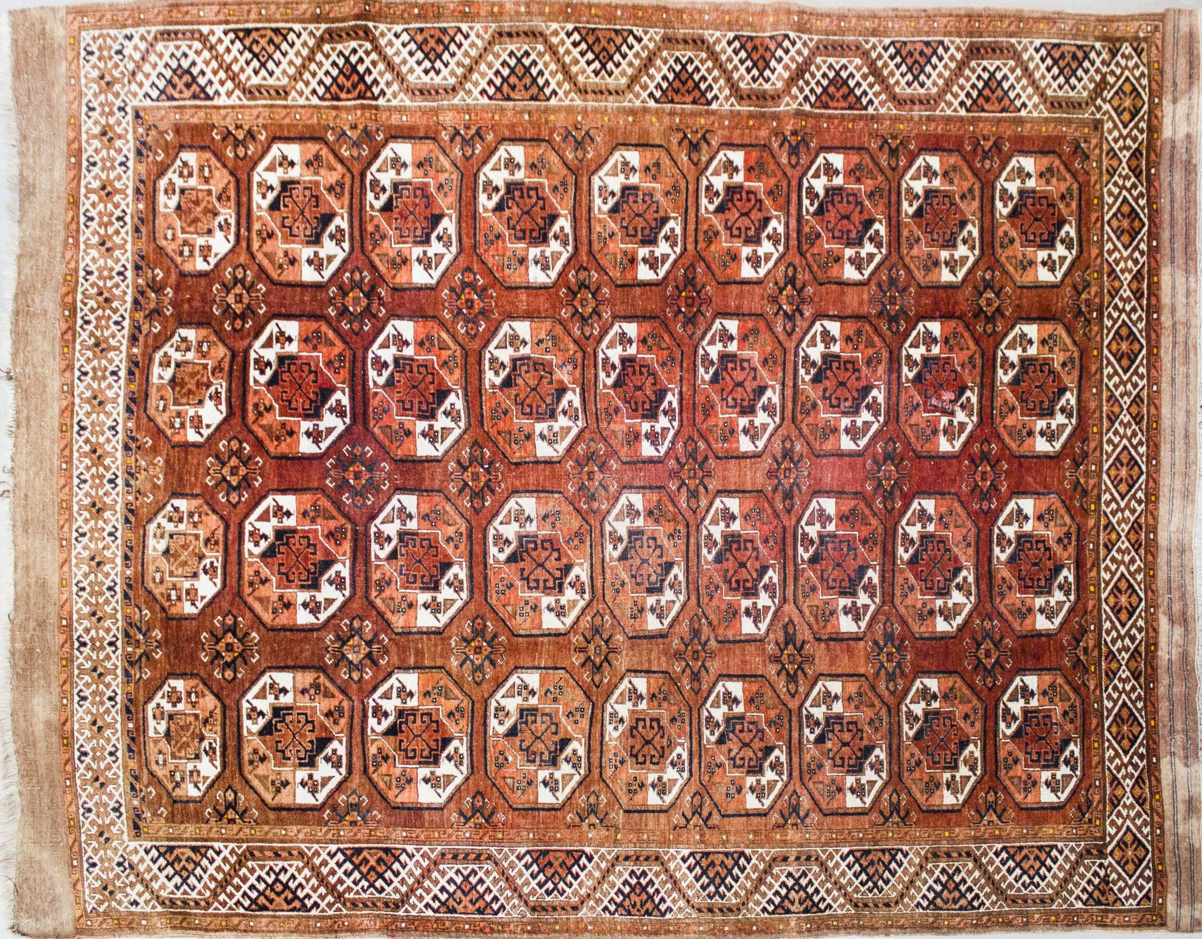 Champ central orné de quatre rangées de güls sur fond brique, bordure à motifs de losanges, 229x295 cm