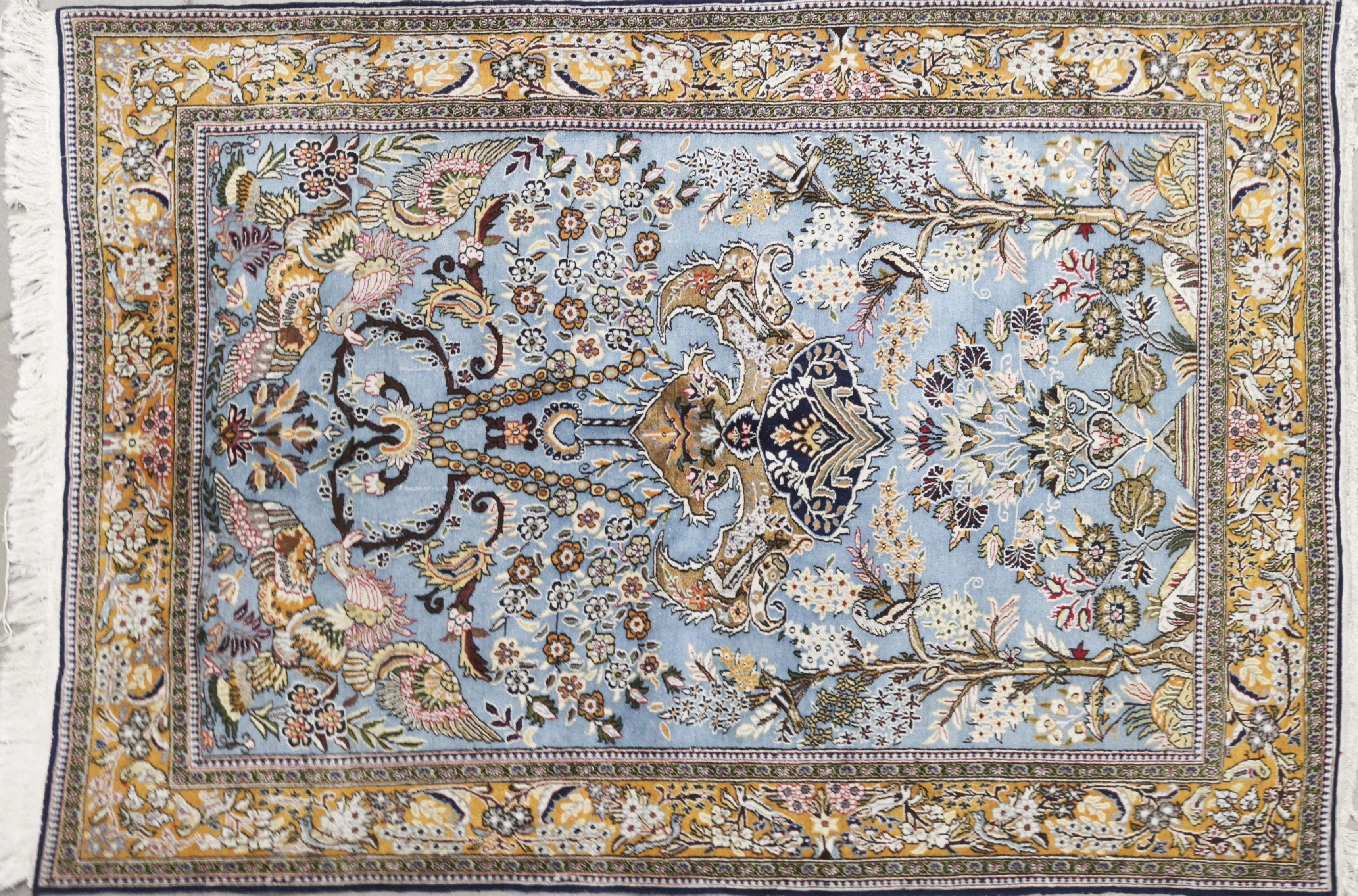 Laine et soie à décor de motifs floraux et arbres sur fond bleu, 140x200 cm