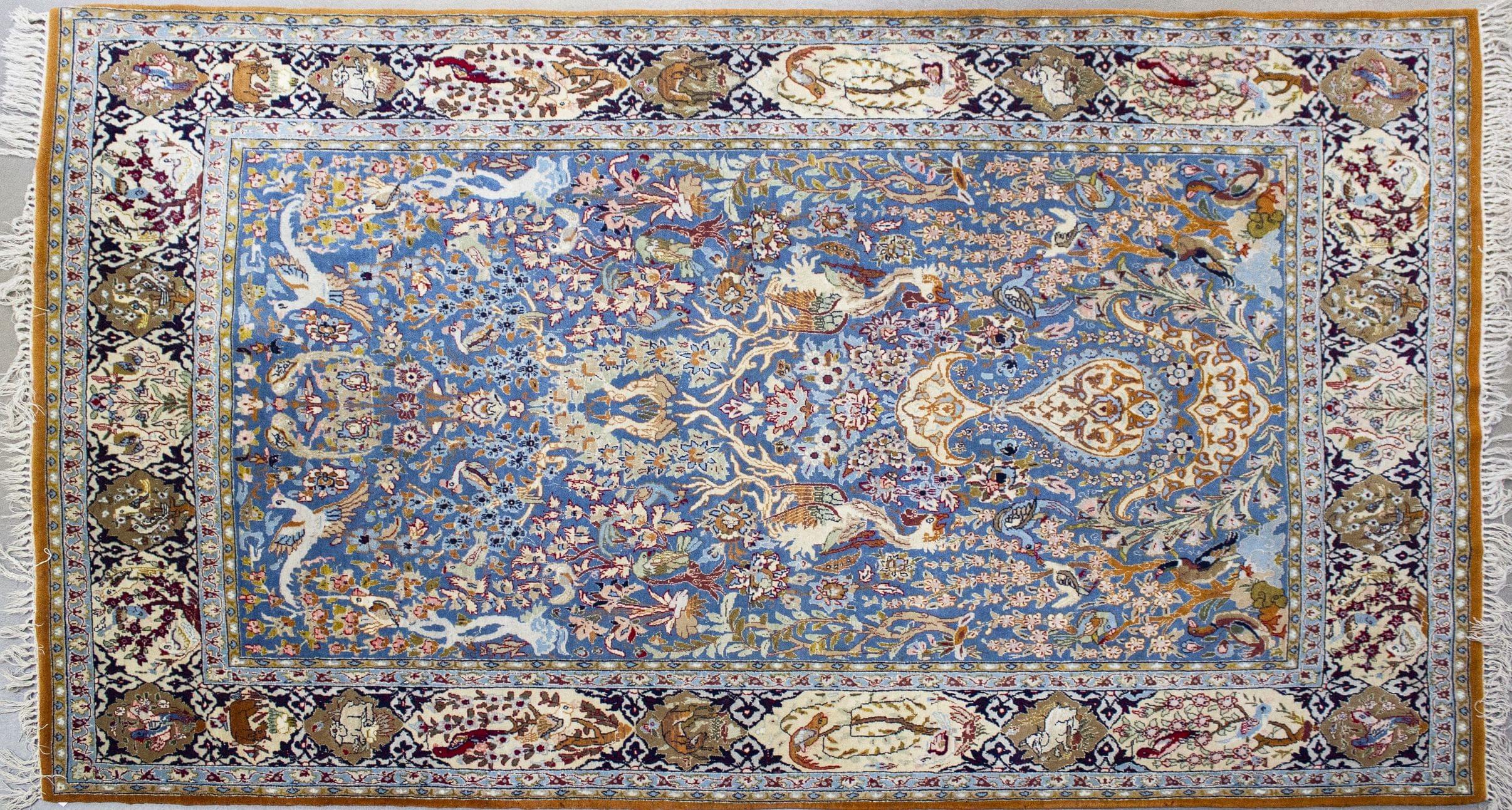 Laine et soie à décor de rinceaux et oiseaux sur fond bleu, 240x154 cm