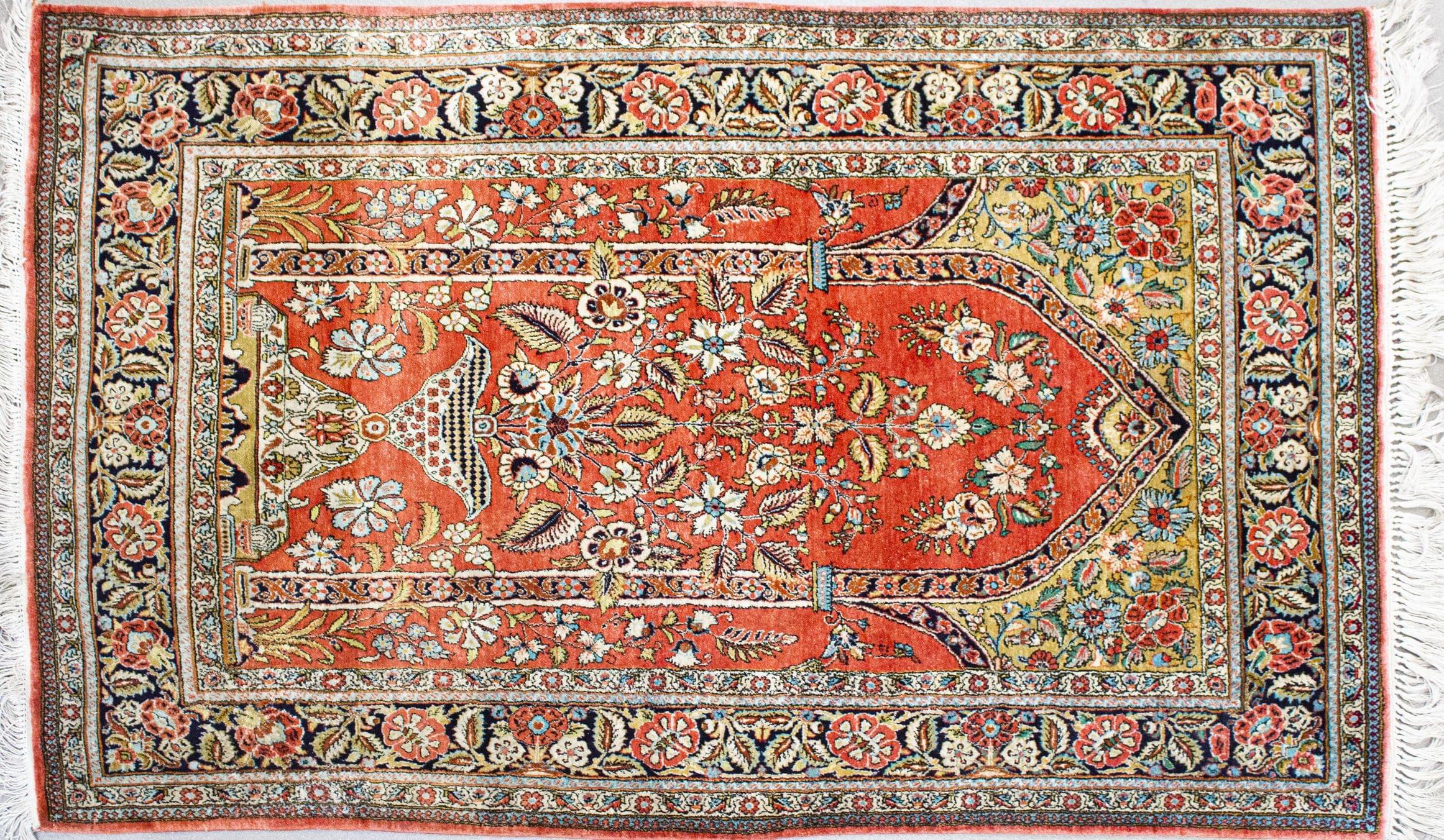 Soie, à décor de mirhab orné d'un vase fleuri, tympans à motifs floraux sur fond moutarde, bordure marine à décor de rosaces entre cinq galons, 162x110 cm