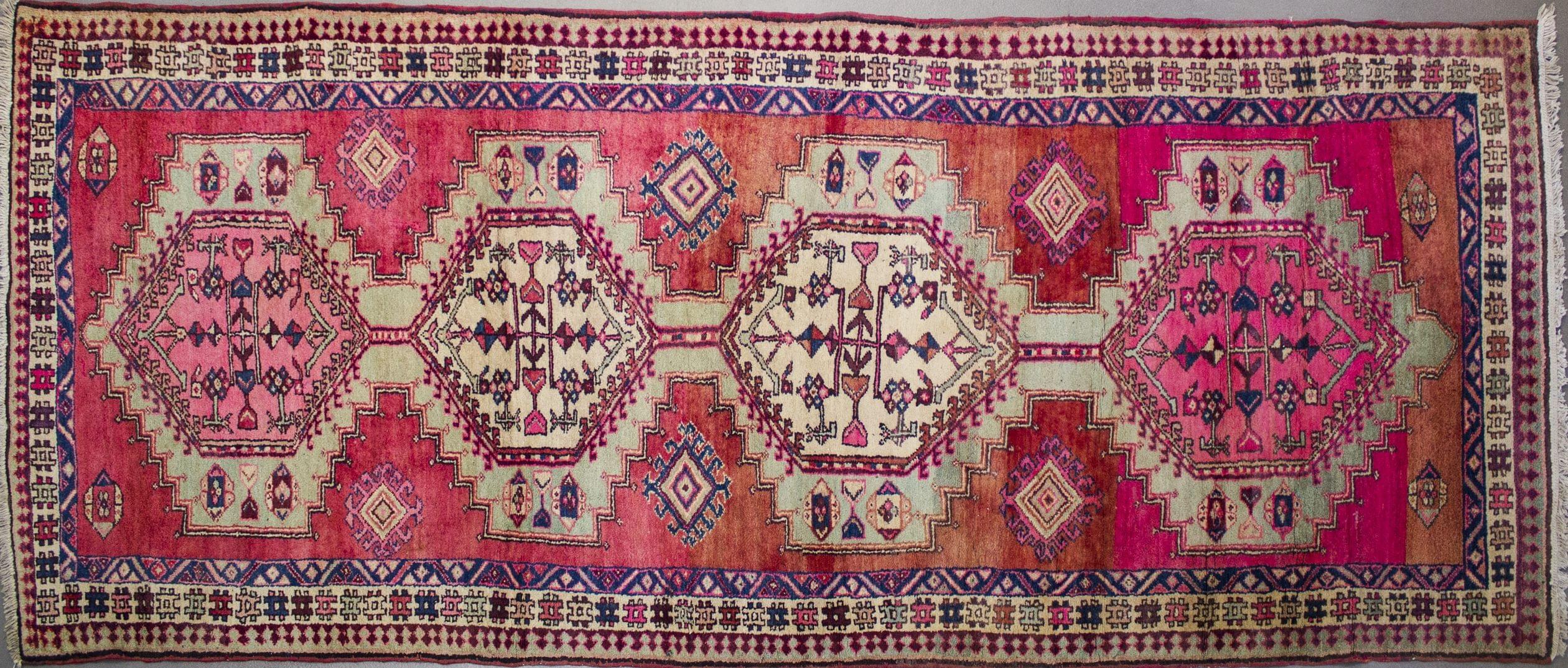 Motif central orné de médaillons à fond rose et ivoire, triple bordure géométrique, 120x310 cm