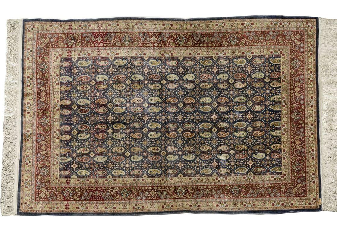 A décor de boteh sur fond bleu foncé, bordure à fleurs sur fond rouge, soie signé, 102x156 cm