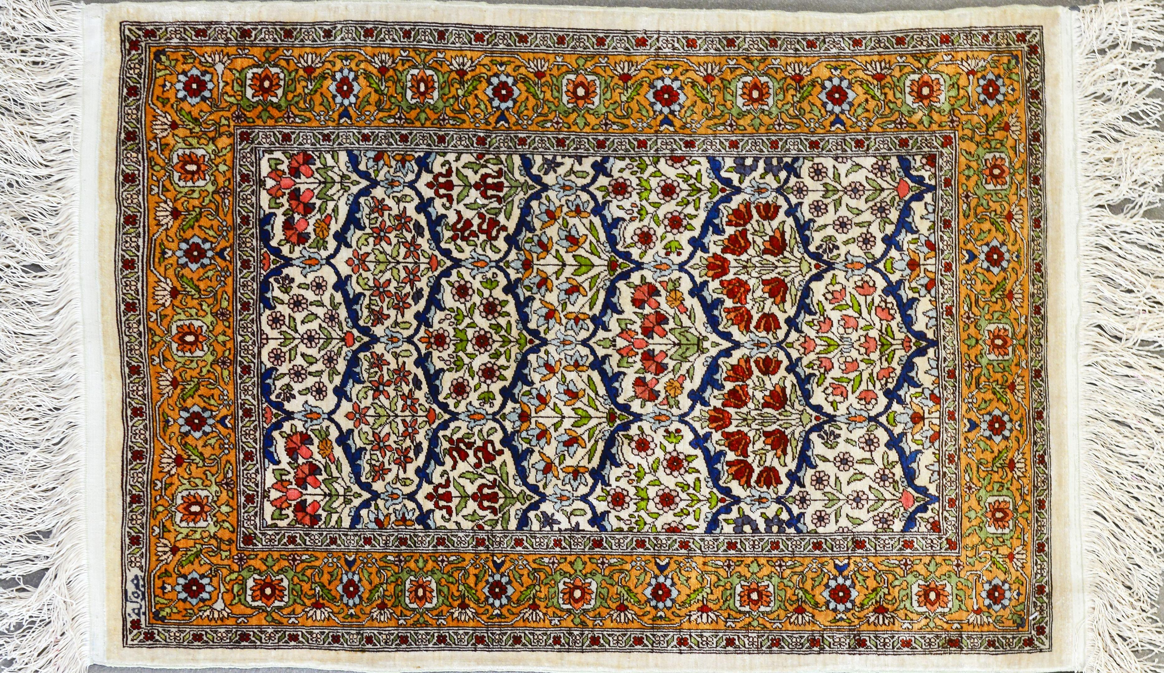 Soie à décor de semis de fleurs sur fond beige, bordure sur fond orangé, 62x86 cm