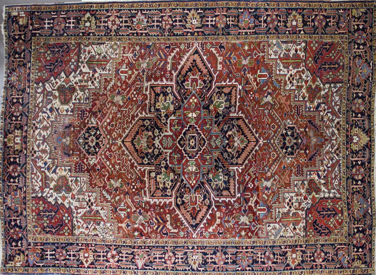 A décor de médaillons bleus sur fond rouge entourés de motifs stylisés, bordure à motifs stylisés sur fond bleu, laine, 271x373 cm