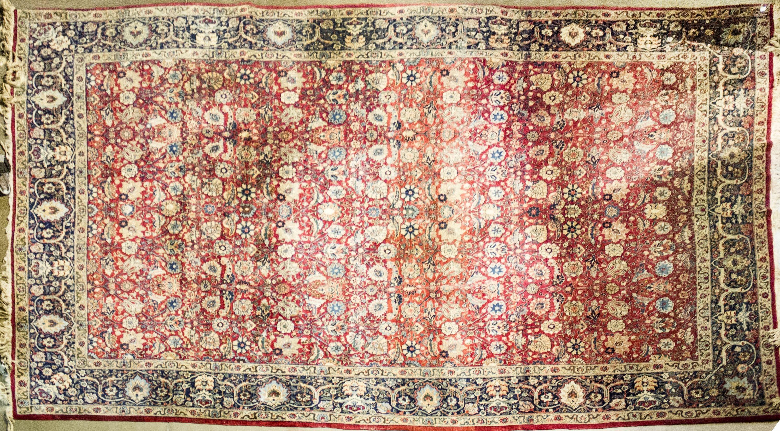 Laine, à décor de semis de fleurs sur fond rouge brique, bordure sur fond bleu, 310x430 cm