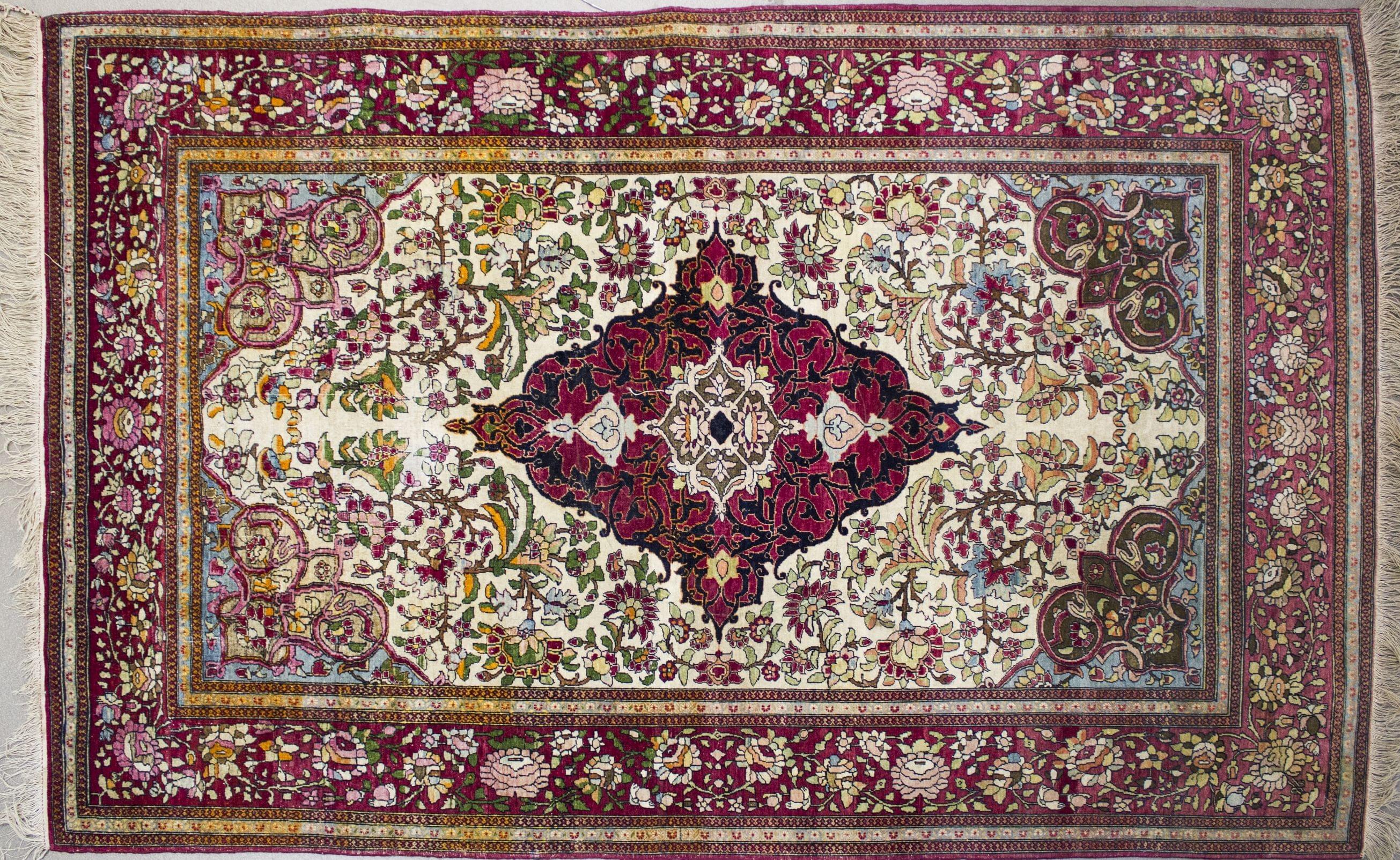 Laine et soie, à décor d'un médaillon central sur fond crème, bordure à décor de rinceaux et fleurs sur fond rouge, 210x136 cm