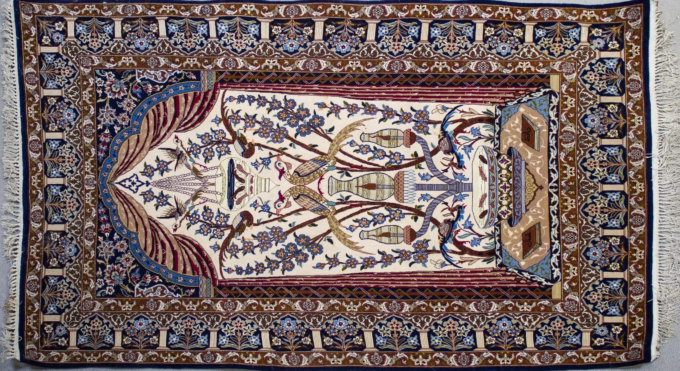 Laine et soie à décor d'un Myrhab orné d'oiseaux branchés, 165x110 cm