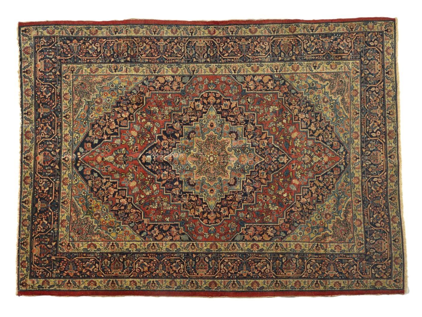 A motifs de médaillons losangiques sur fond rouge, bordure bleu...