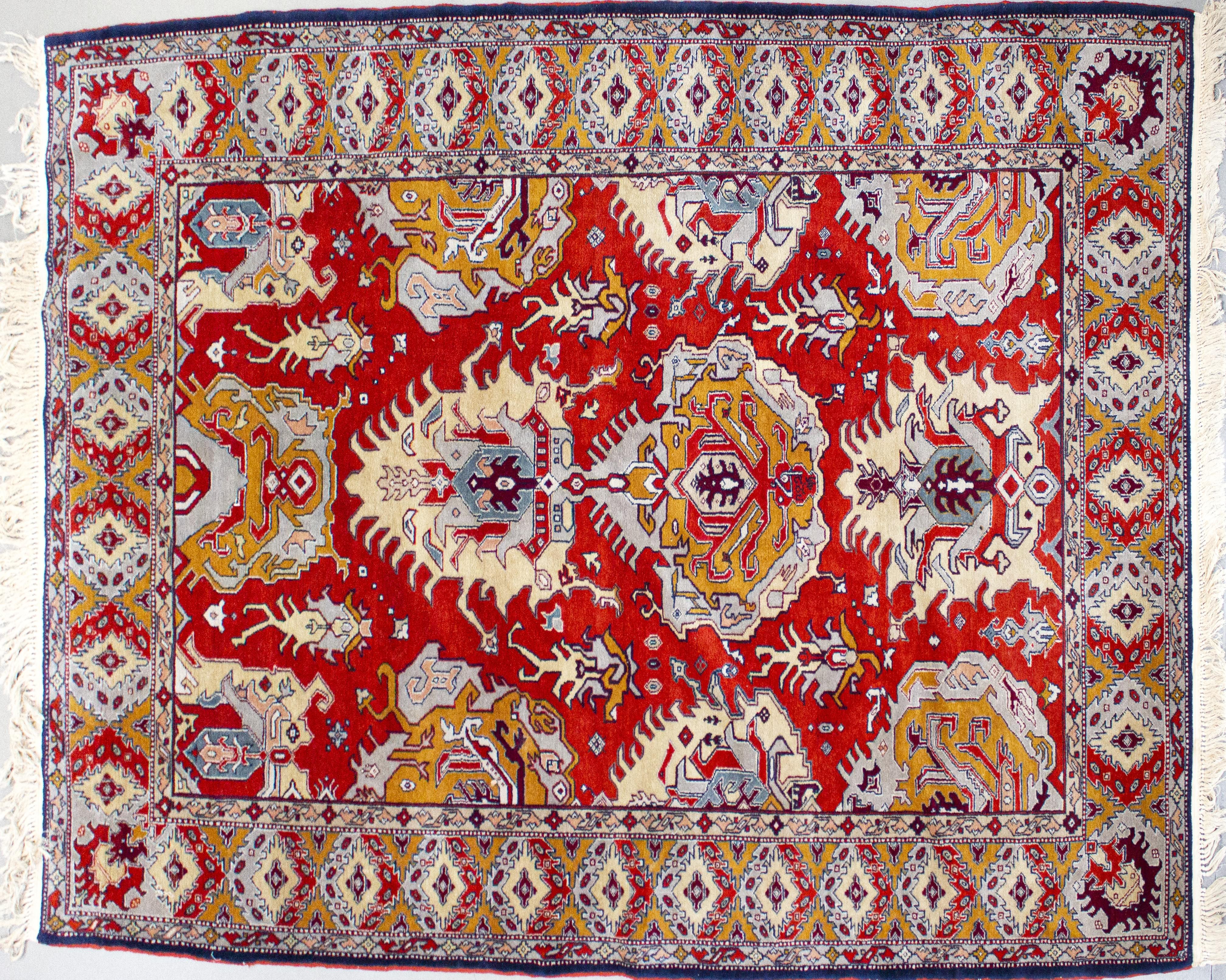 Laine à motifs stylisés sur fond rouge brique, 295x184 cm