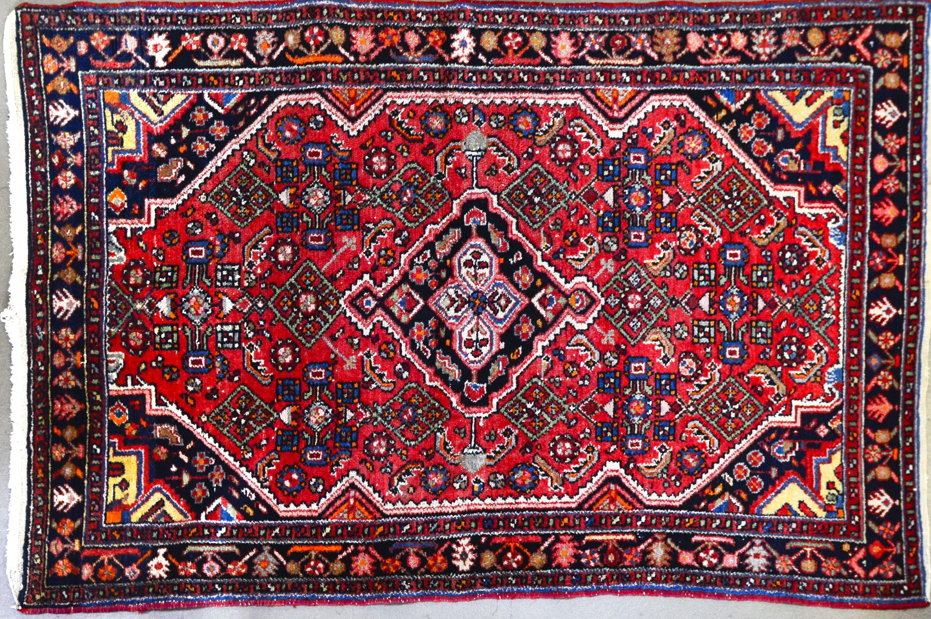 A motifs stylisés sur fond rouge et bordure bleu marine, 188x126 cm
