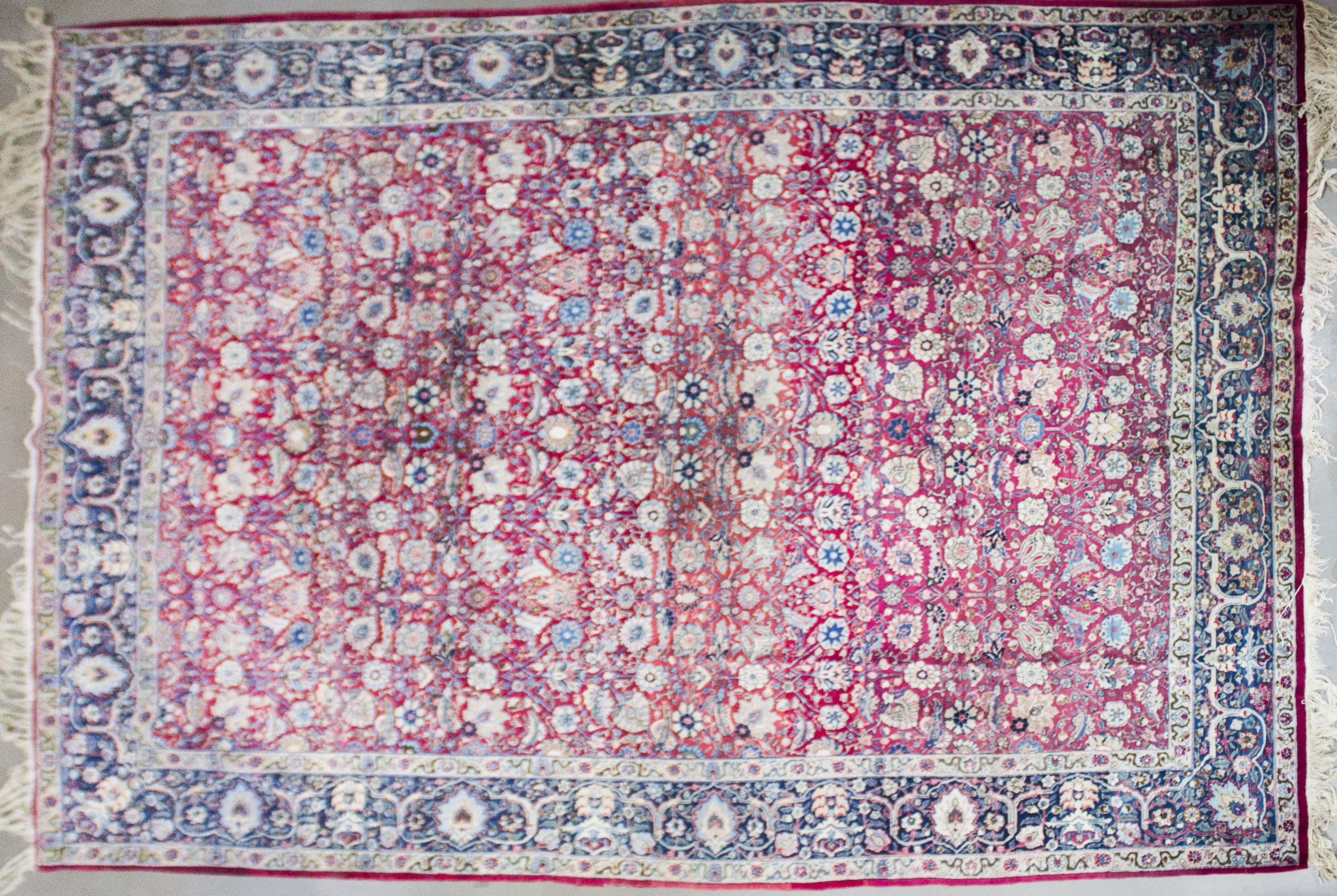 Laine, à décor de semis de fleurs sur fond rouge brique, bordure sur fond bleu, 310x430 cm
