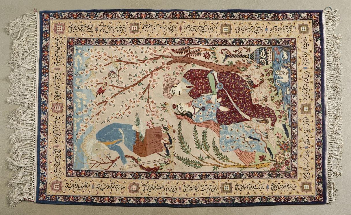 A décor de personnages, bordure ornée de sourates, laine et soie, 156x107 cm