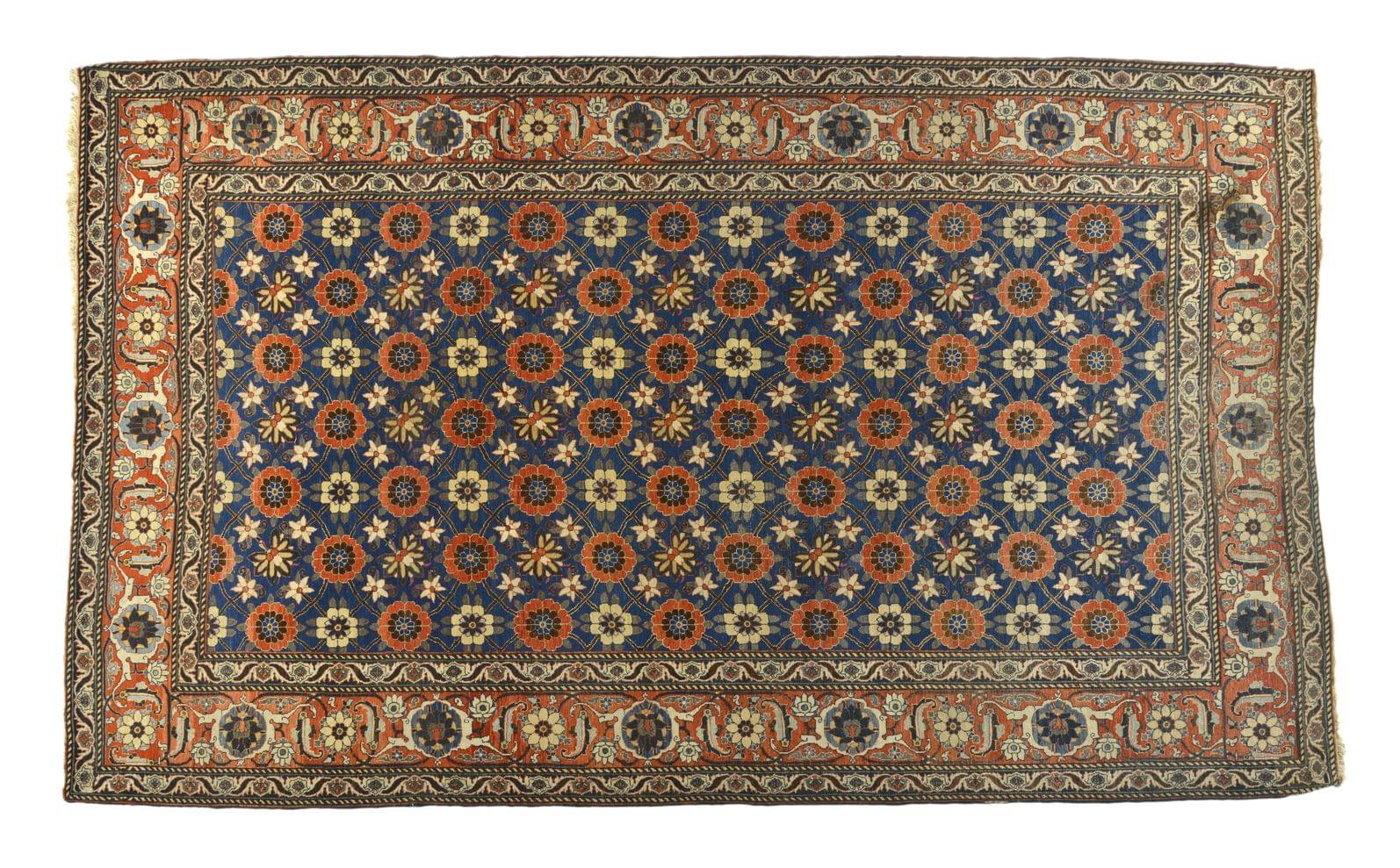 A motifs polychromes sur fond bleu ciel, laine179x297 cm