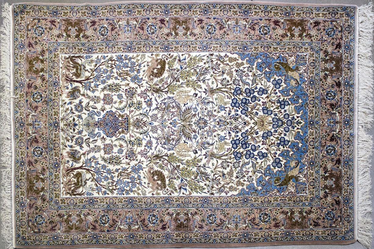 A décor de mihrab et scènes de chasse sur fond crème, laine et soie, 152x238 cm