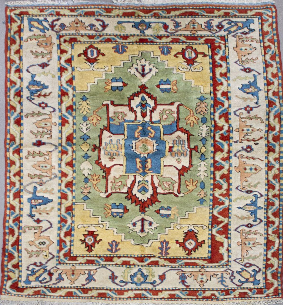 A décor d'un médaillon central sur fond vert clair, bordure sur fond ivoire, 161x228 cm