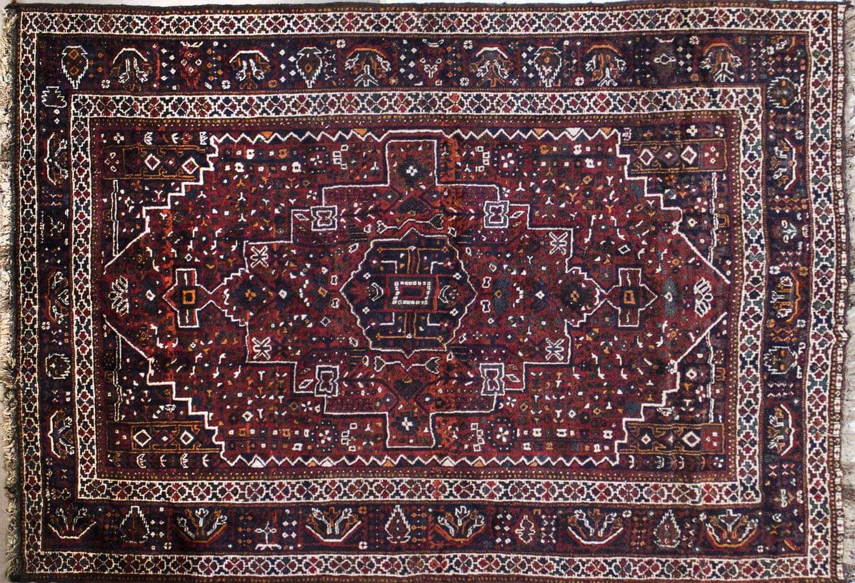 Laine à décor de motifs géométriques sur fond rouge brique, 246x...
