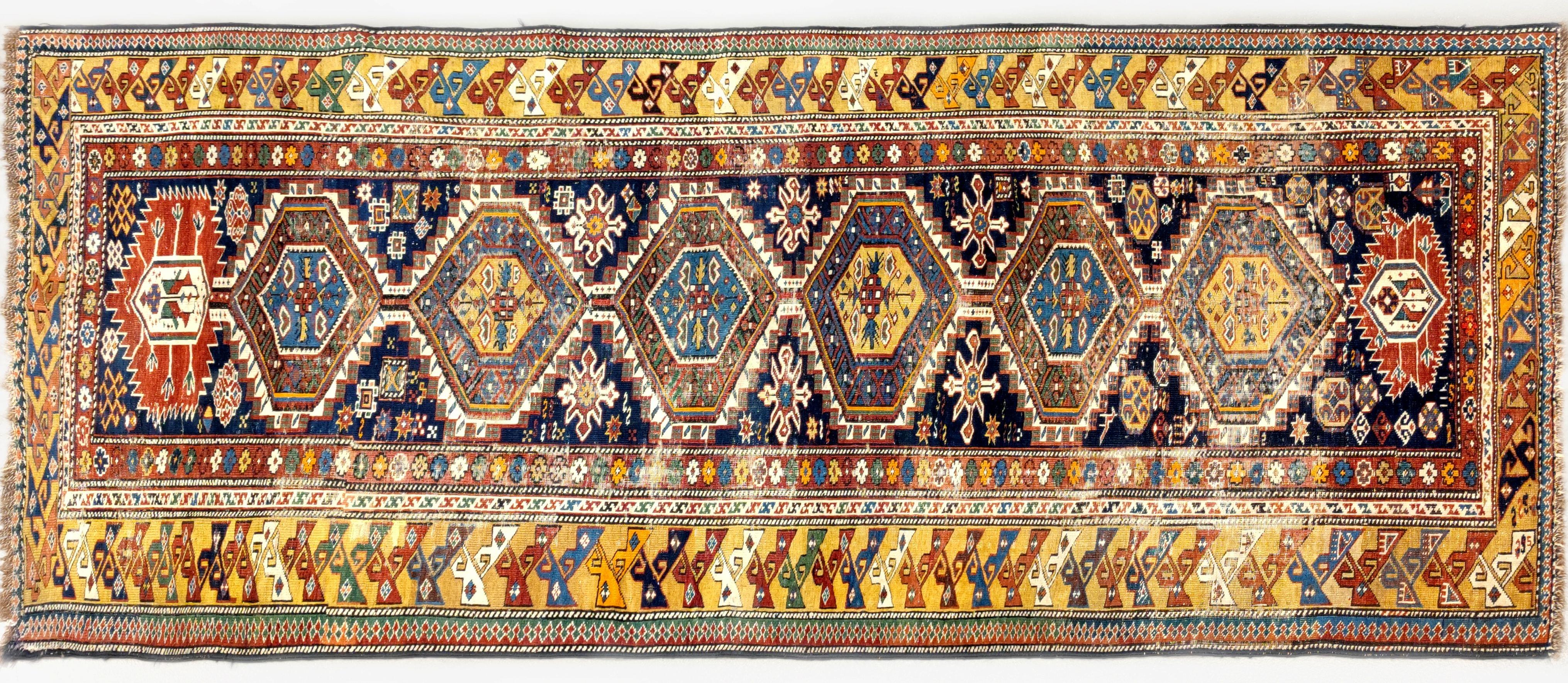 Laine et soie à motifs géométriques sur fond orange,, 59x107 cm