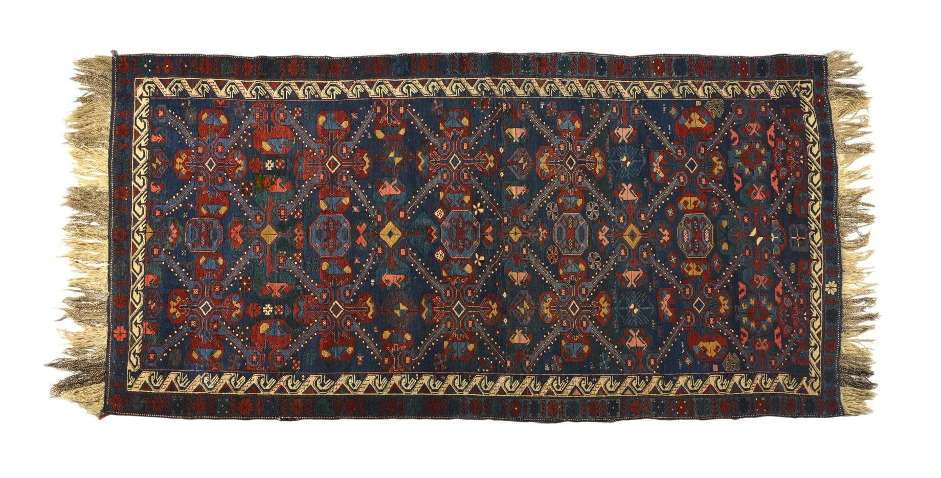 A motifs polychromes sur fond bleu ciel, laine179x297 cm