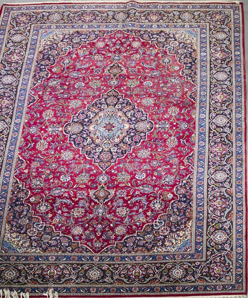 A décor d'un médaillon central à fond bleu, champ central orné de fleurs et de feuilles sur fond rouge, bordure à fleurs sur fond bleu foncé, XXe s, 270x337 cm