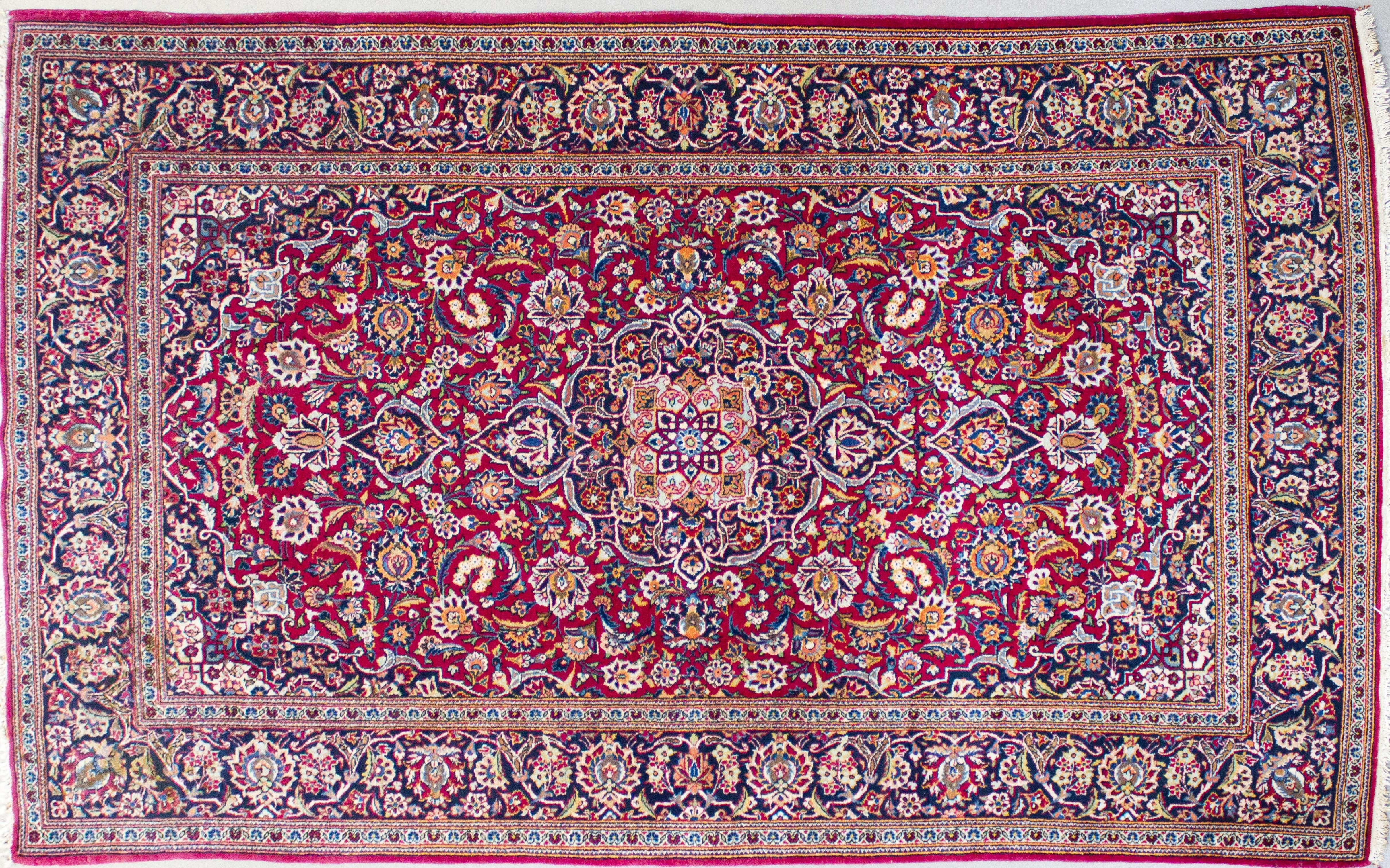 A décor d'un médaillon central sur fond bleu et feuilles sur fond rouge, bordure à fleurs sur fond bleu, 130x215 cm