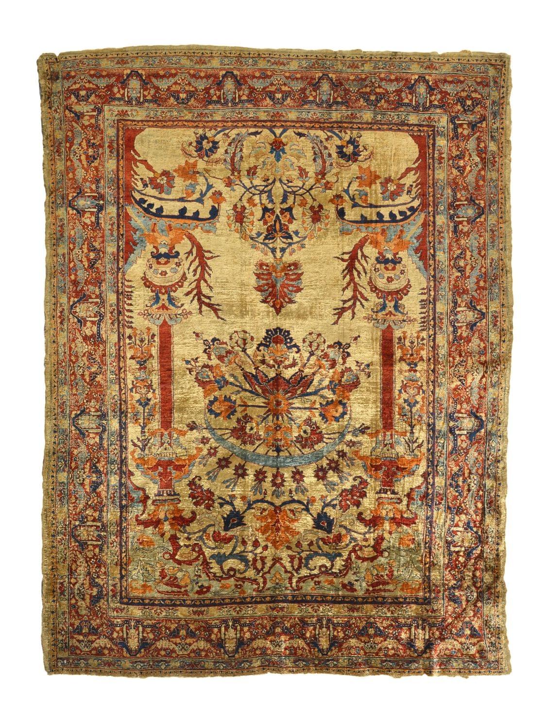 A décor de 2 colonnettes sur fond rouge brique, ancien, soie, XIXe s, 194x140 cm. Provenance: Cornette de Saint Cyr, Drouot, 1981. A Kachan, Mohtasham carpet