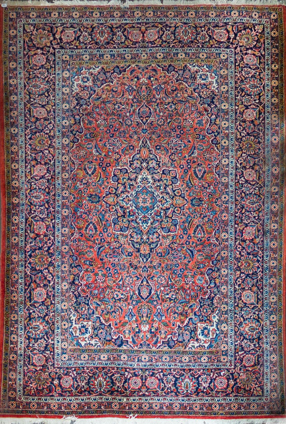 A motifs de médaillons losangiques sur fond rouge, bordure bleu...