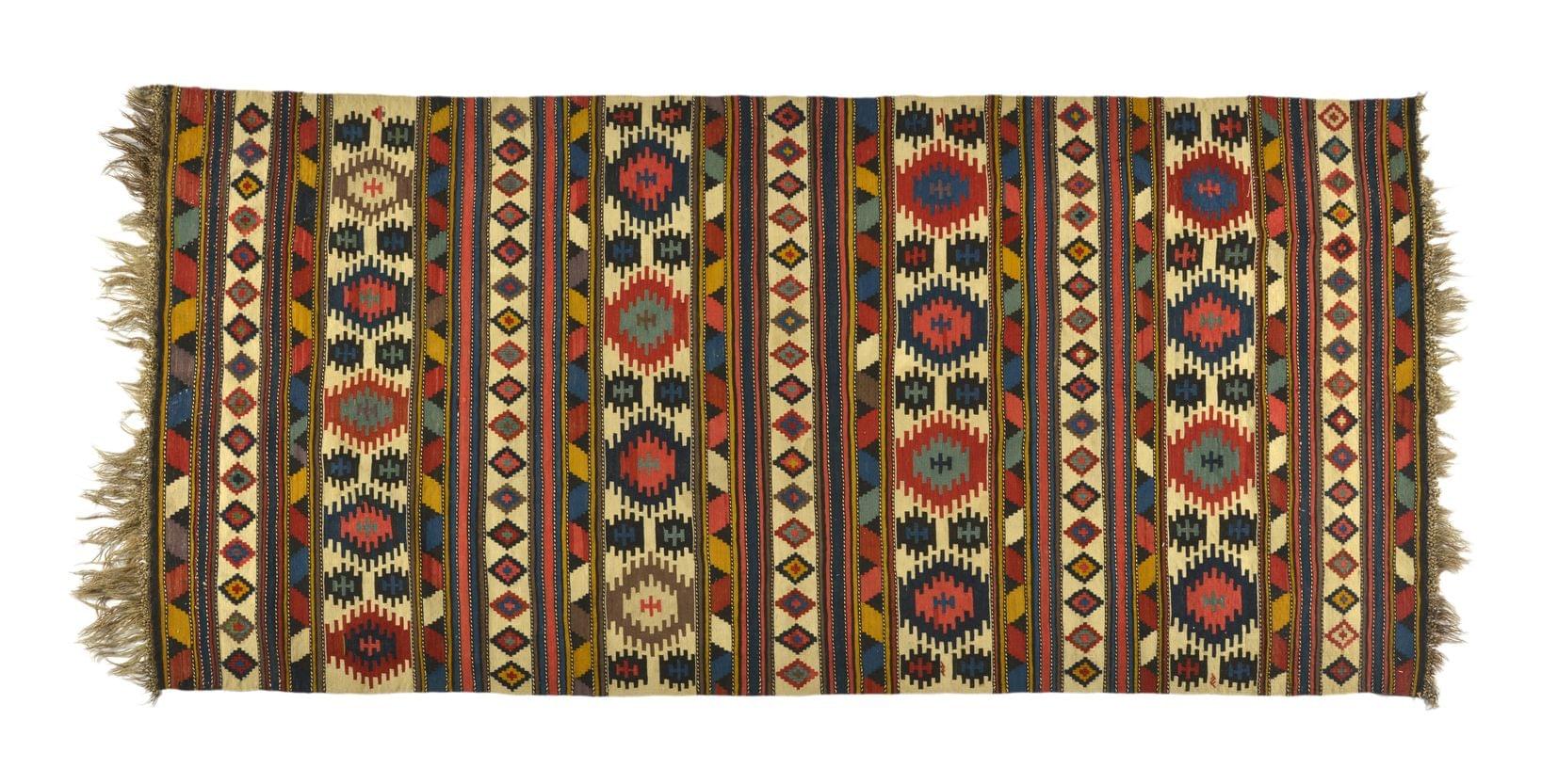 A motifs polychromes sur fond bleu ciel, laine179x297 cm