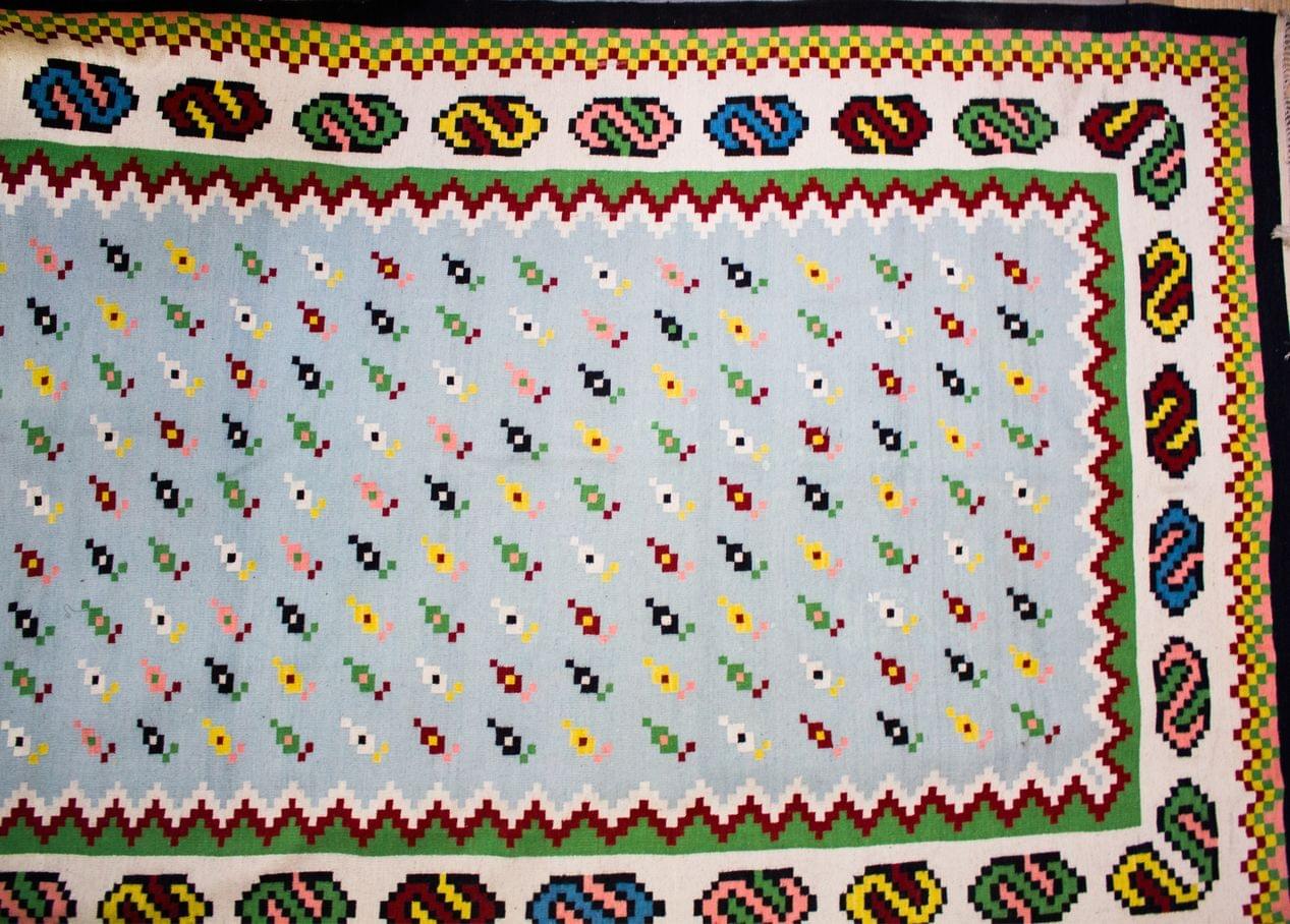 A motifs de médaillons losangiques sur fond rouge, bordure bleu...
