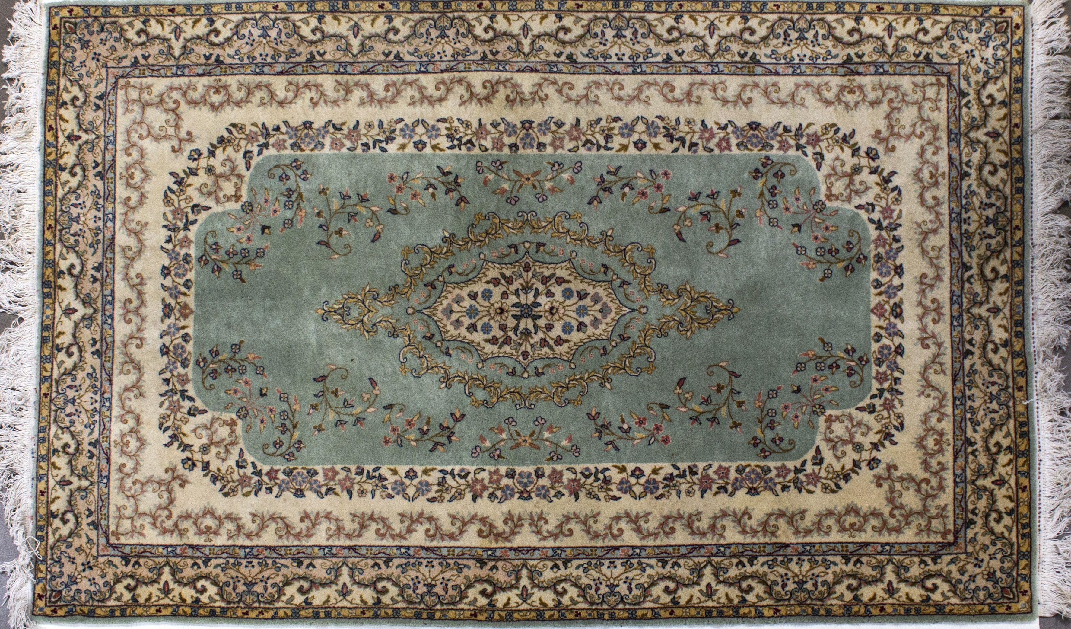 A décor d'un médaillon central à fleurs sur fond ivoire entouré de rinceaux sur fond bleu ciel, bordure à rinceaux sur fond beige, 270x170 cm