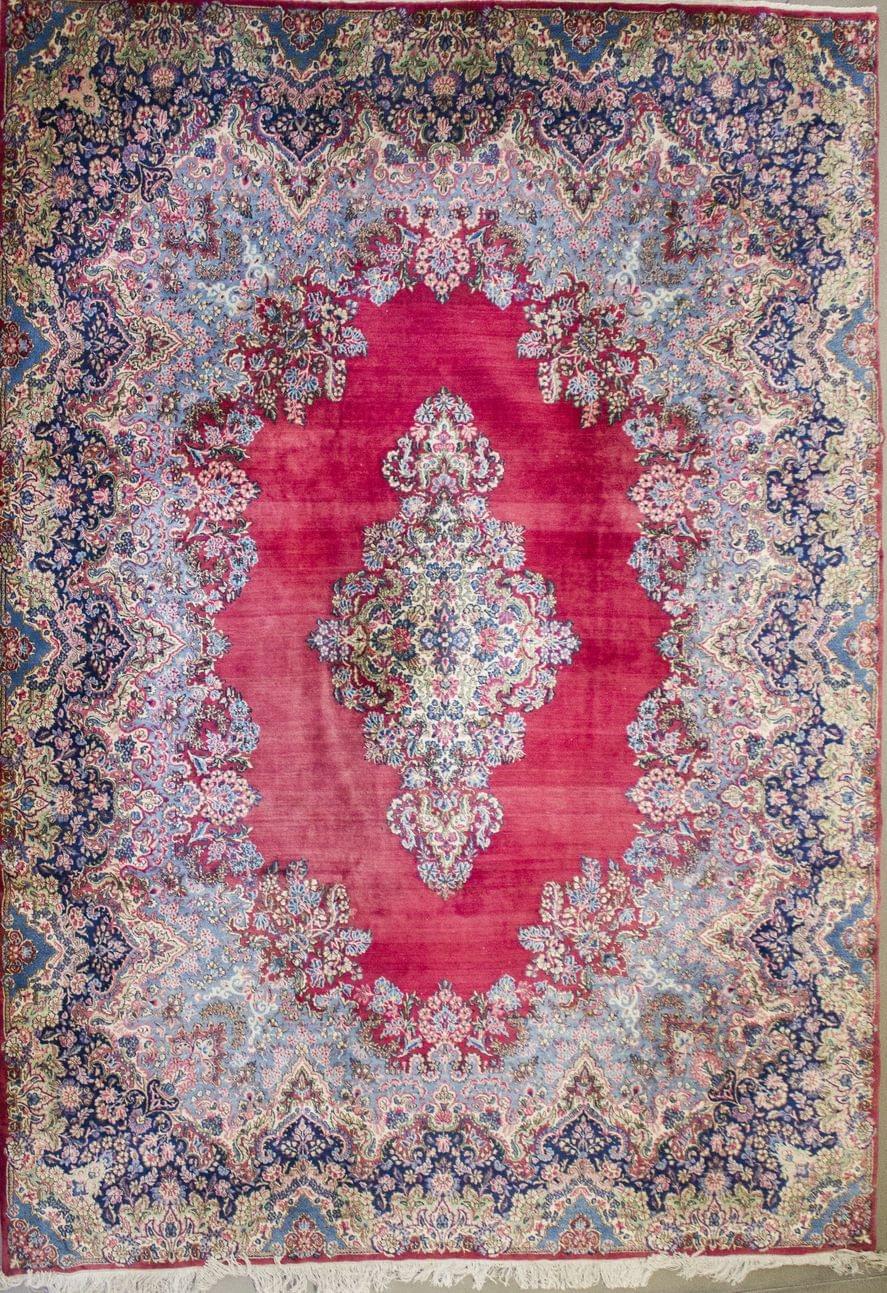 A décor d'un médaillon central orné de fleurs sur fond rouge entouré de fleurs sur fond bleu ciel, bordures à fleurs, 271 x 378 cm