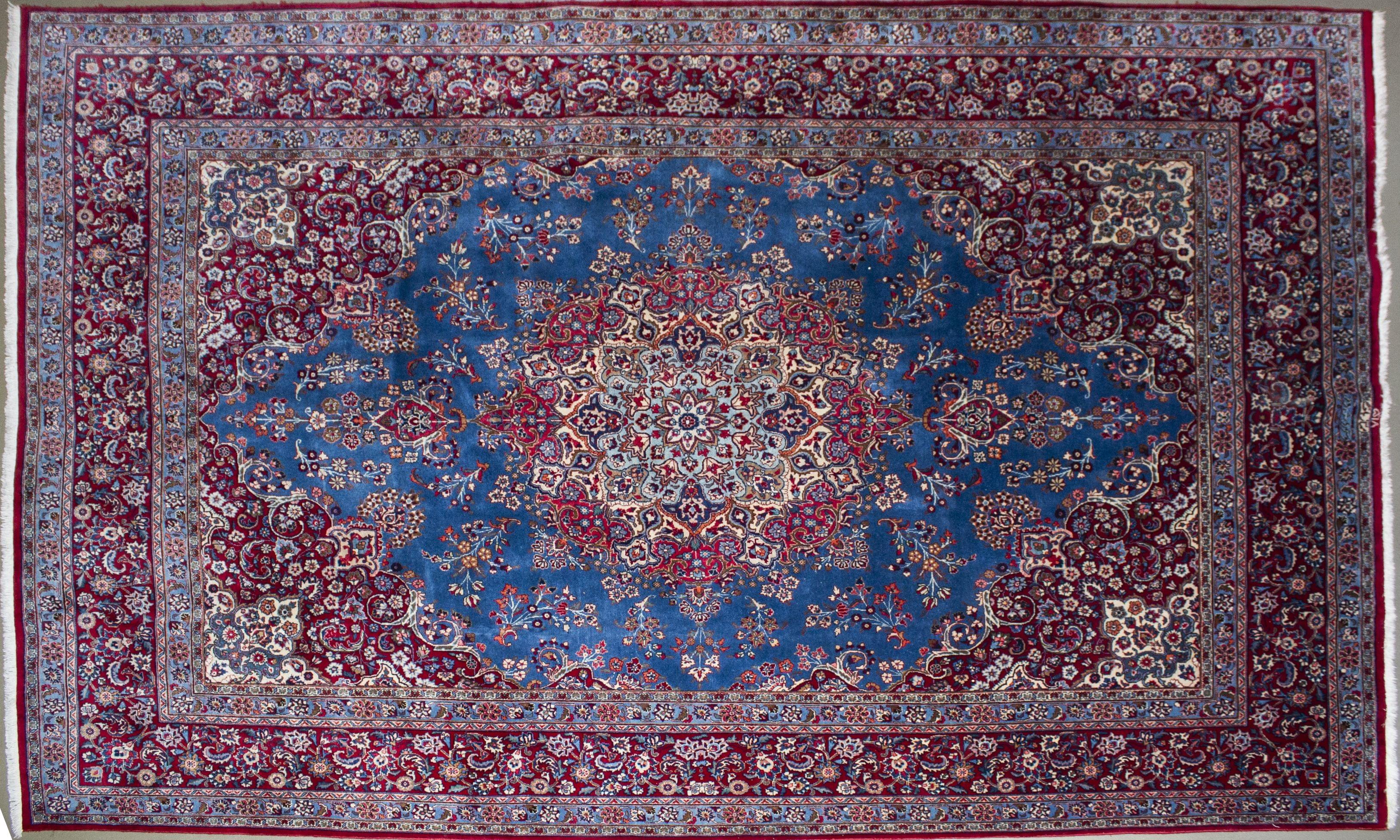 Motif central sur fond bleu, bordure sur fond rouge, fine bande bleue sur l'extérieur avec motifs floraux, 251x342 cm