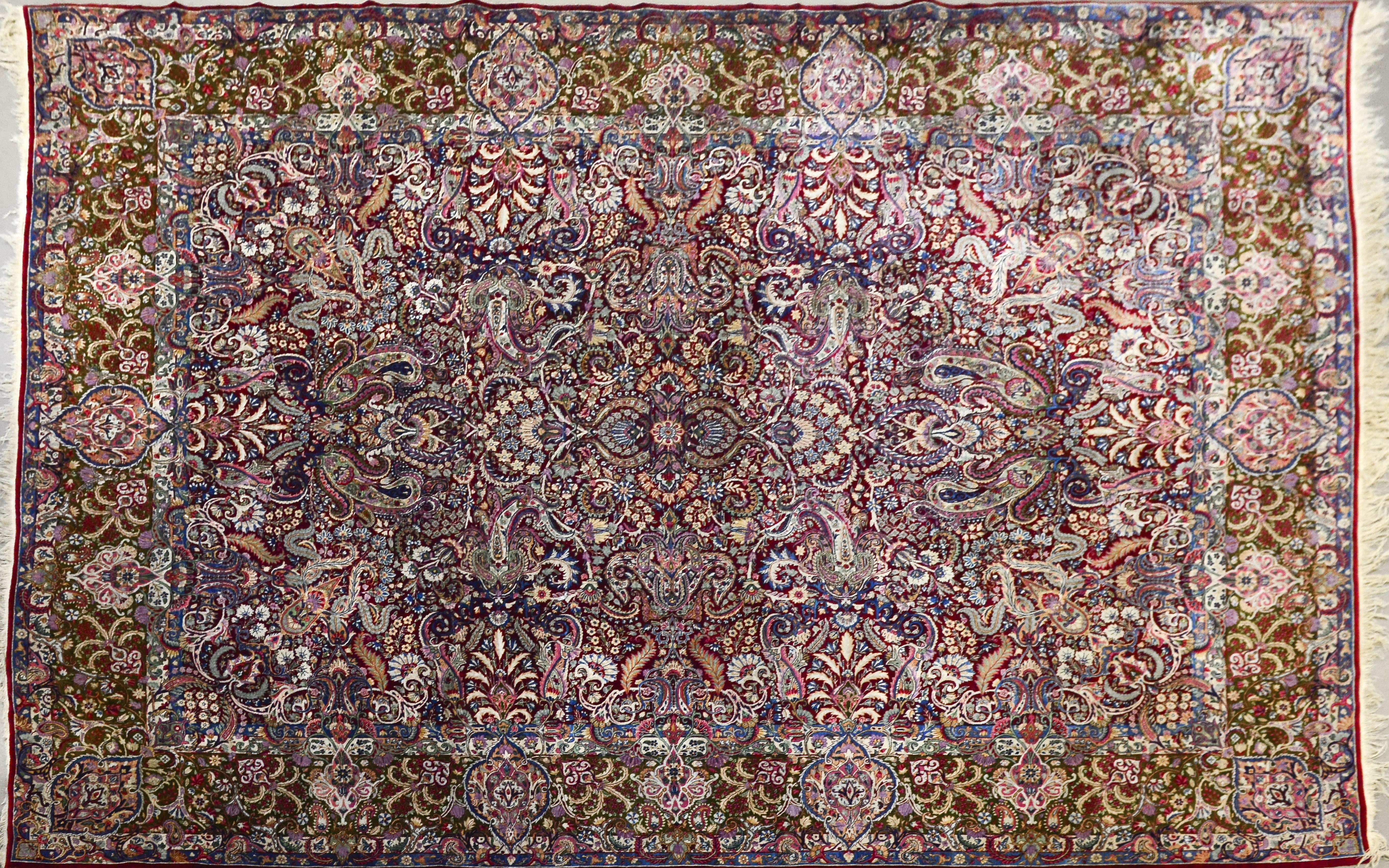 A décor de fleurs et botehs sur fond pourpre, bordure sur fond vert, 283x364 cm