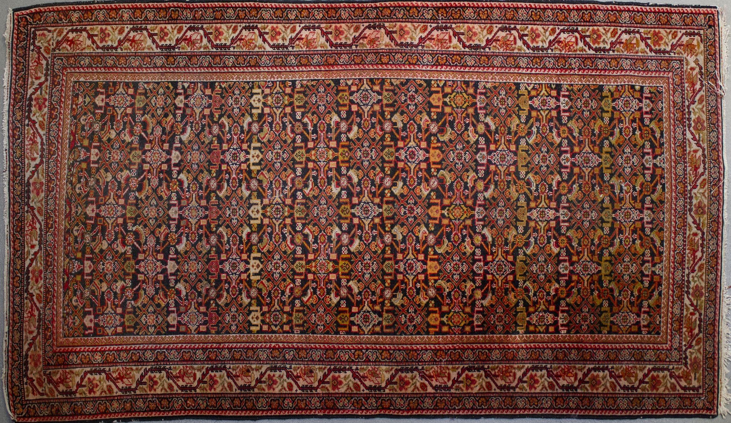 Laine à motifs stylisés sur fond noir, bordure ornée de rinceaux sur fond crème, 202x115 cm