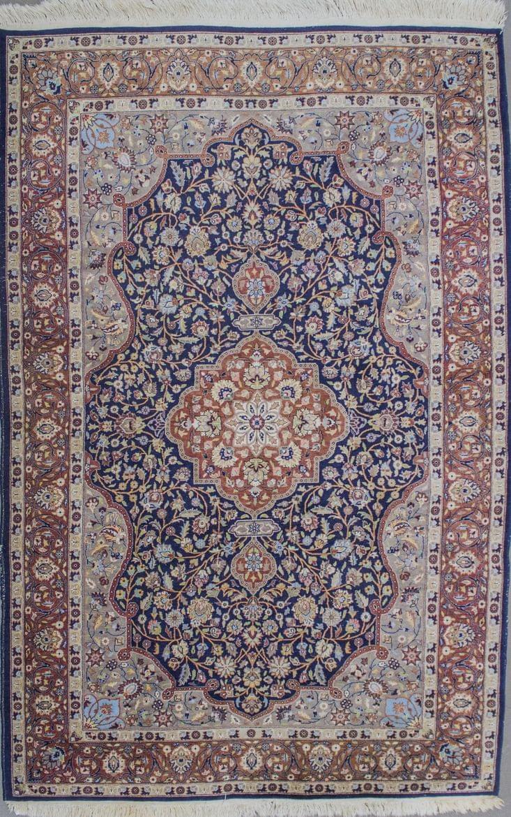 A décor de médaillon central sur fond bleu nuit, bordure mauve et beige, laine, 219x140 cm