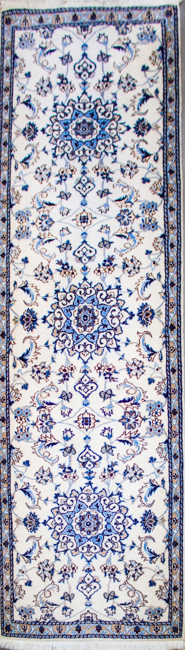 A décor de motifs bleu ciel sur fond crème, laine, 281x80 cm