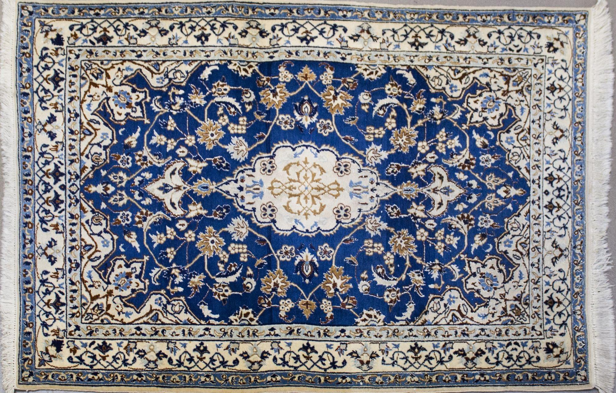 A décor d'un médaillon central entouré de fleurs sur fond bleu, bordure à fond ivoire, 101x143 cm