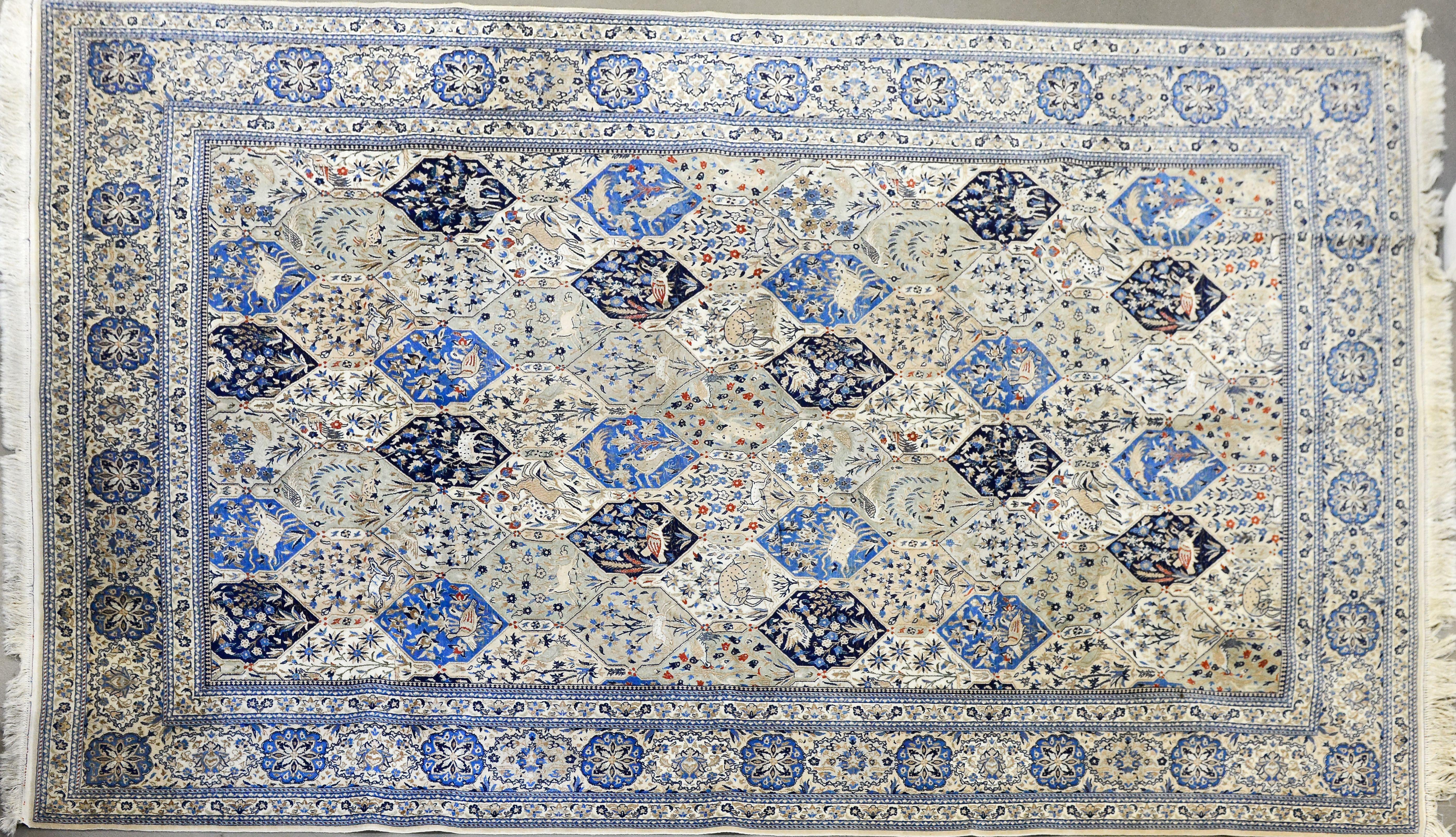 Laine et soie à décor de fleurs et animaux inscrits dans des losanges polychromes, 254x376 cm