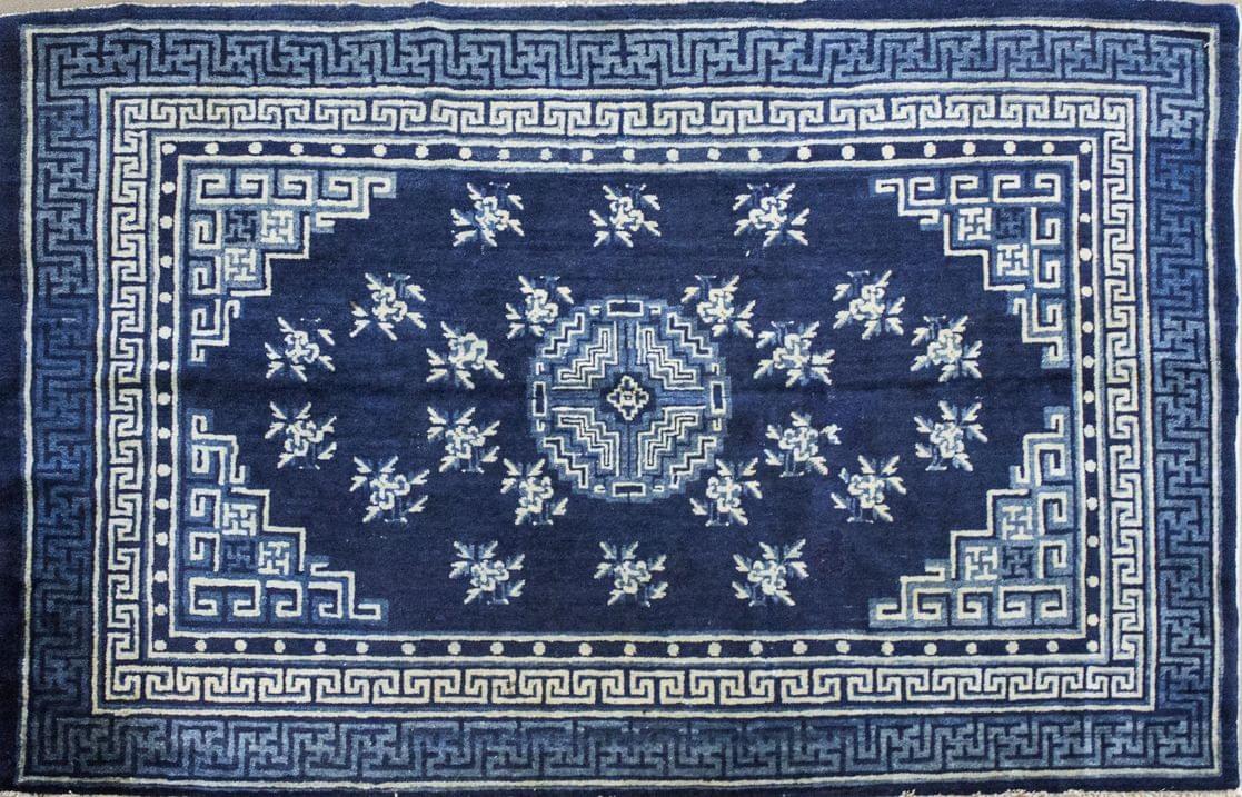 A décor d'un médaillon central entouré de fleurs stylisées sur fond bleu, bordure à motifs géométriques, 120x187 cm