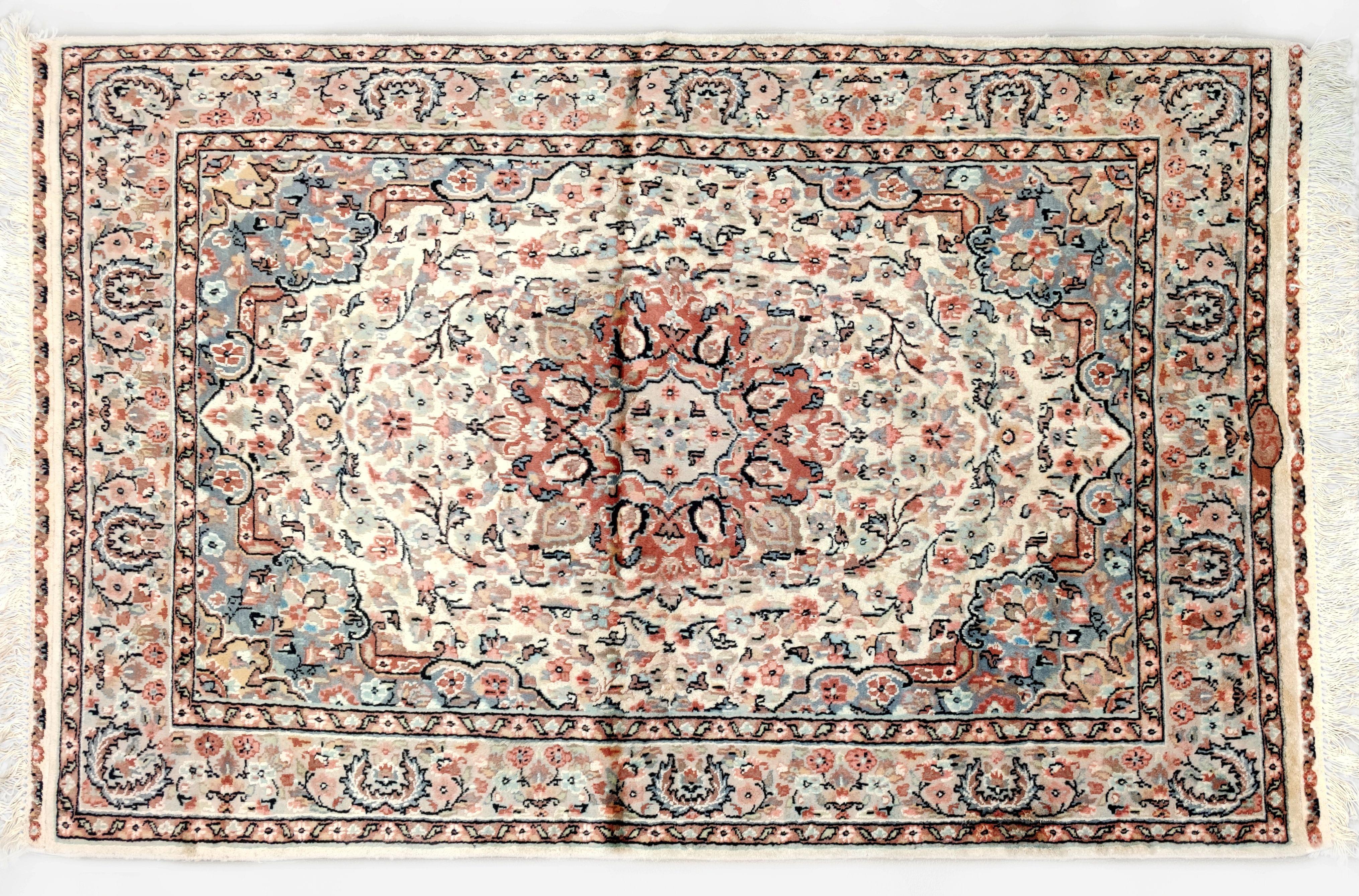 Soie à motif central rayonnant rose sur fond beige, 123x180 cm