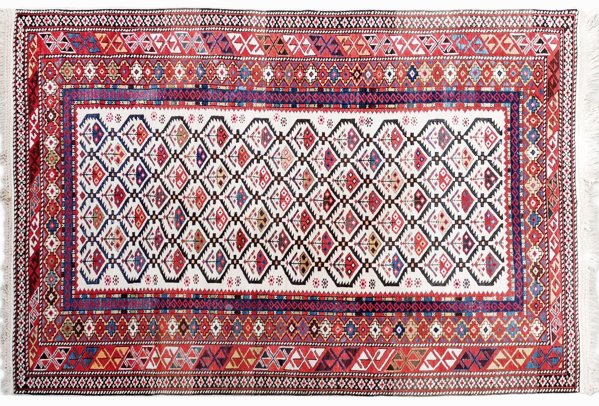 A motif central sur fond rouge, bordure sur fond bleu, 400x360 c...
