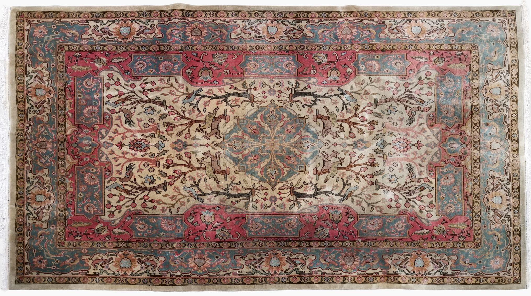 Laine à décor d'un médaillon central entouré d'arbres et d'animaux sur fond ivoire, bordure à motifs d'oiseaux, 201x301 cm