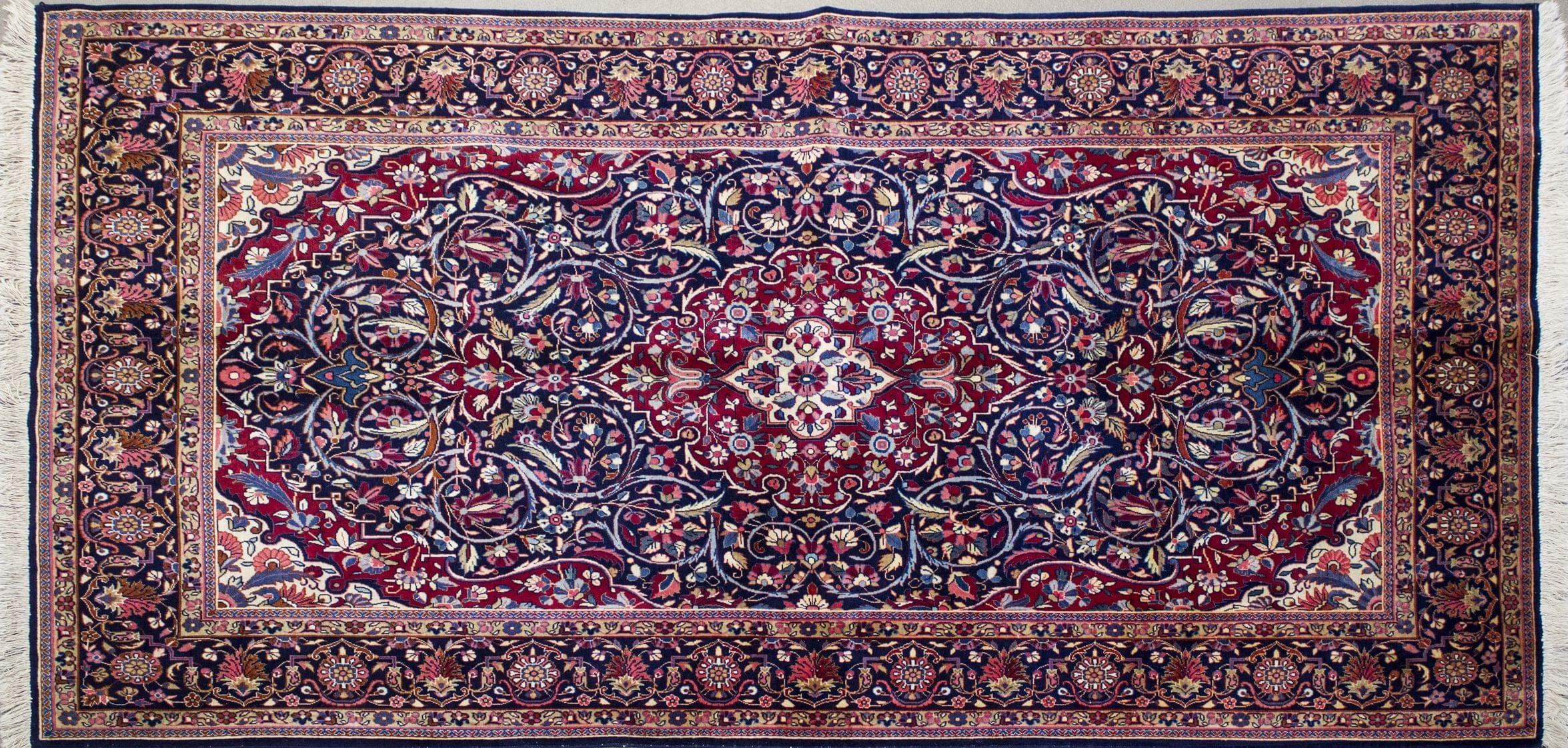 Laine à décor d'un médaillon central sur fond bleu nuit orné de rinceaux, 320x226 cm