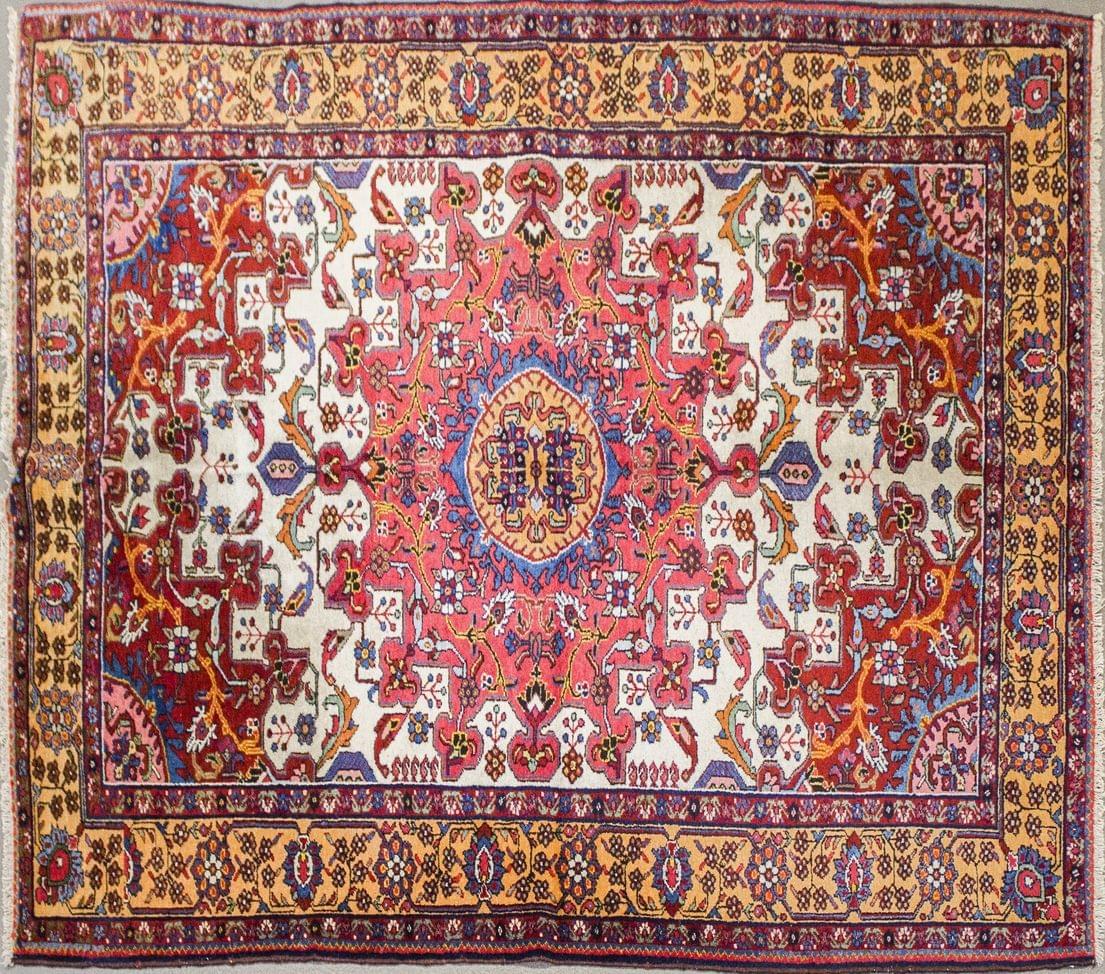 A décor d'un médaillon central en forme d'étoile à fond rose entouré de fleurs et de feuilles sur fond ivoire, bordure à fleurs sur fond abricot, 142 x 194 cm