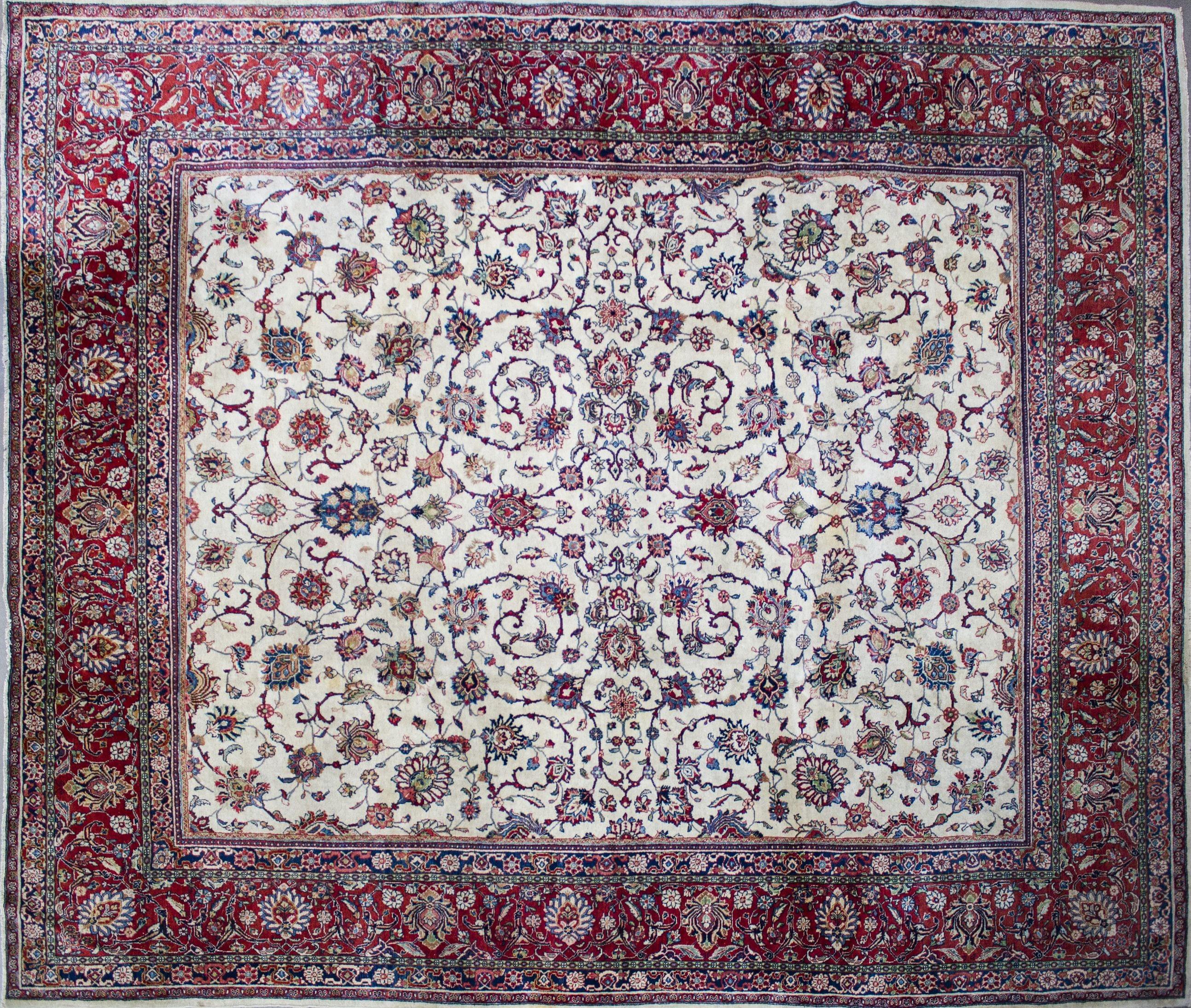 A décor de formes géométriques sur fond beige, bordure à fleurs sur fond ivoire, 300x397 cm