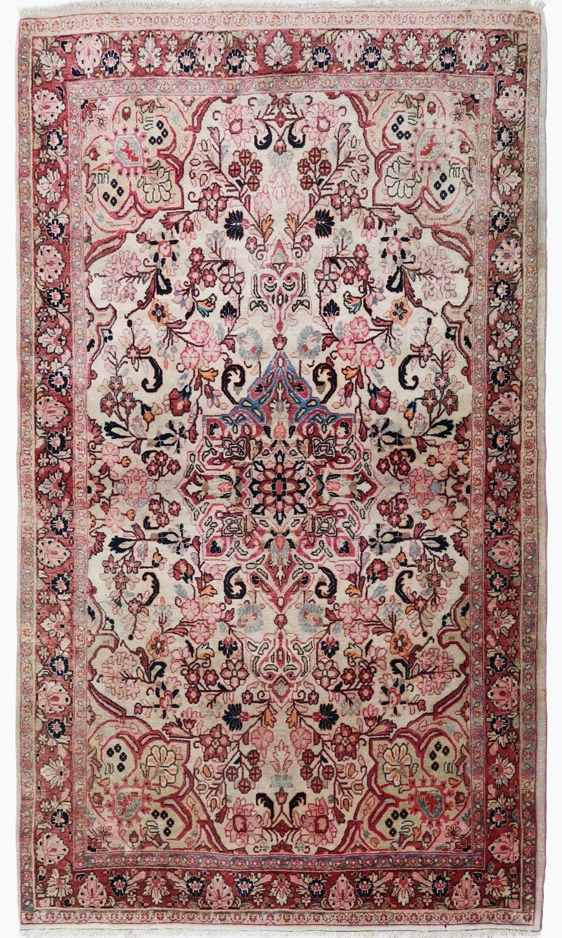 Laine à motif d'un médaillon central entouré de fleurs sur fond ivoire, bordure à fleurs sur fond rouge pâle, 140x211 cm