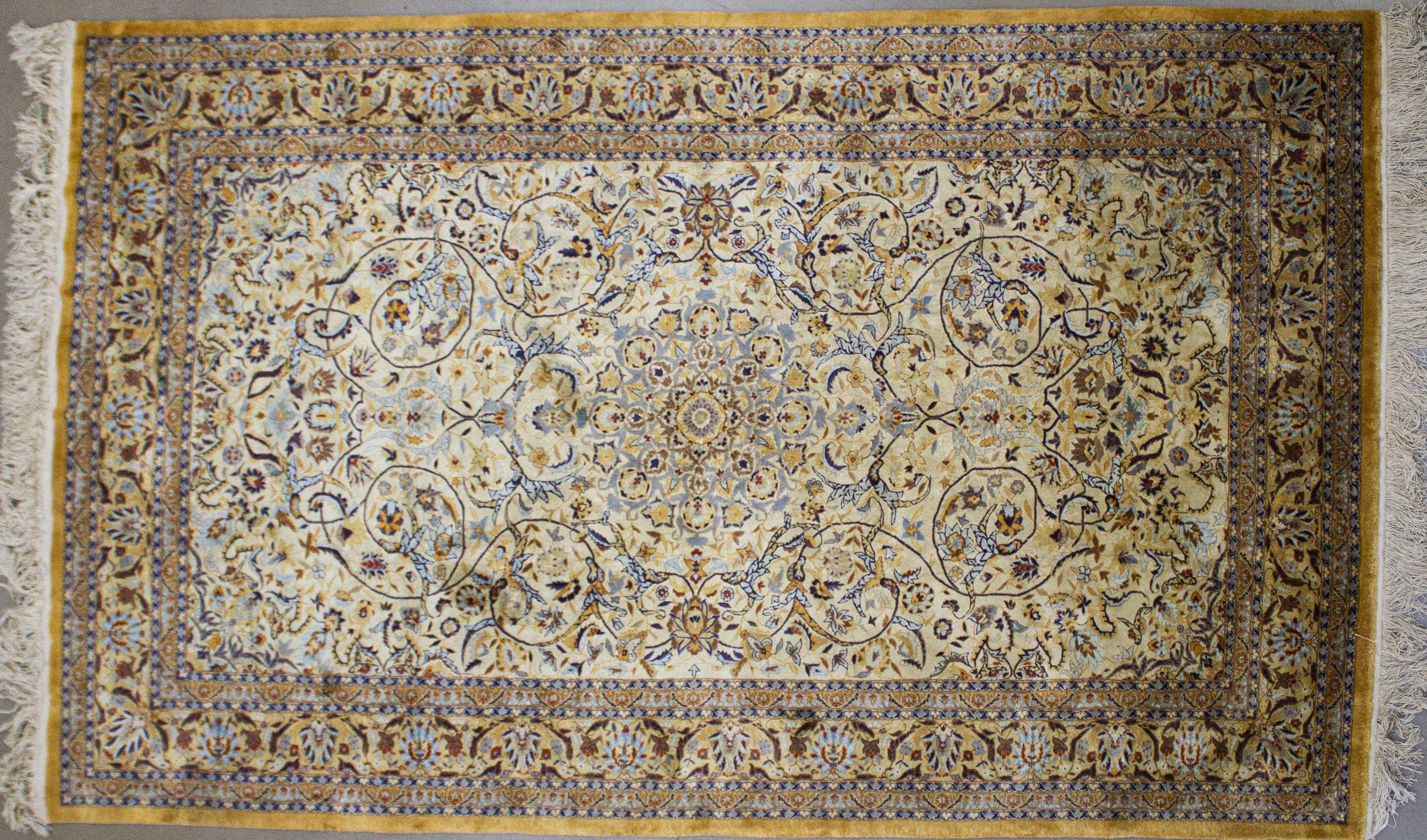 Soie à décor d'une rosace centrale sur fond or de rinceaux fleuris, bordures à fond or de motifs floraux ivoire entre six galons de feuilles stylisées, 182x314 cm