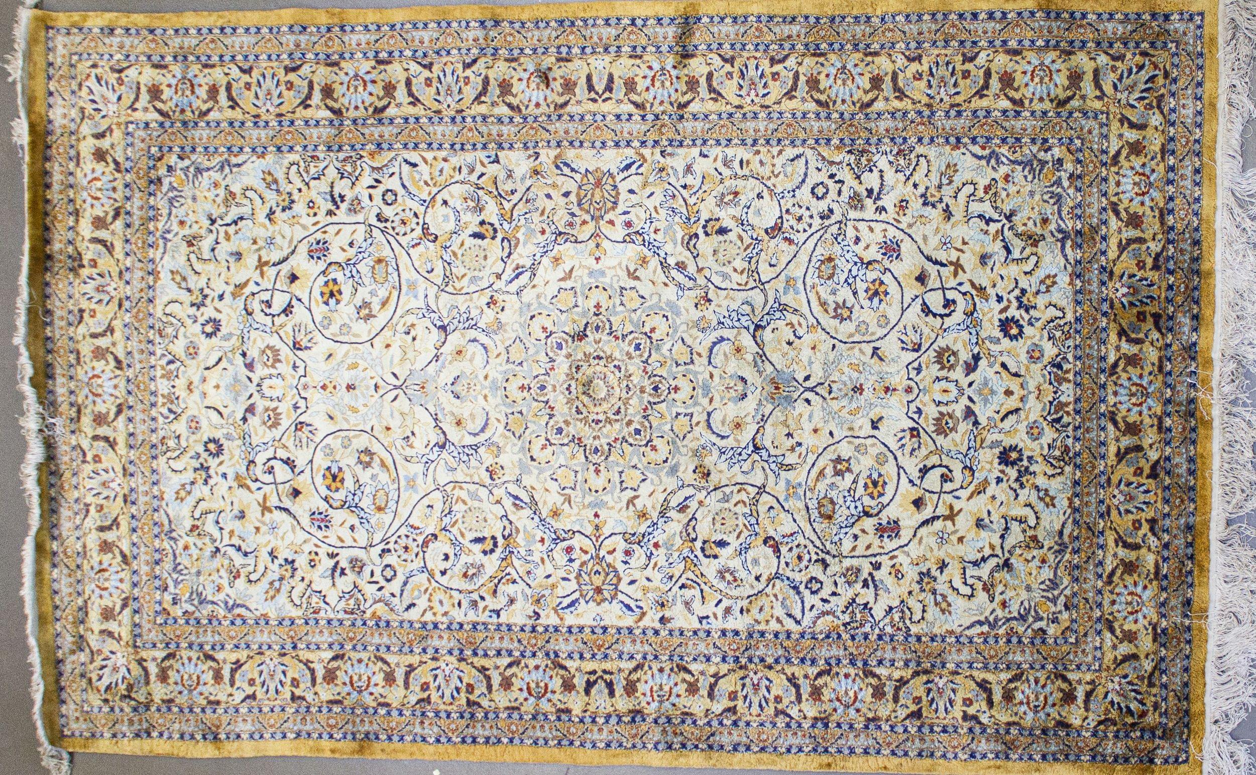 Soie à décor d'une rosace centrale sur fond or de rinceaux fleuris, bordures à fond or de motifs floraux ivoire entre six galons de feuilles stylisées, 185x311 cm